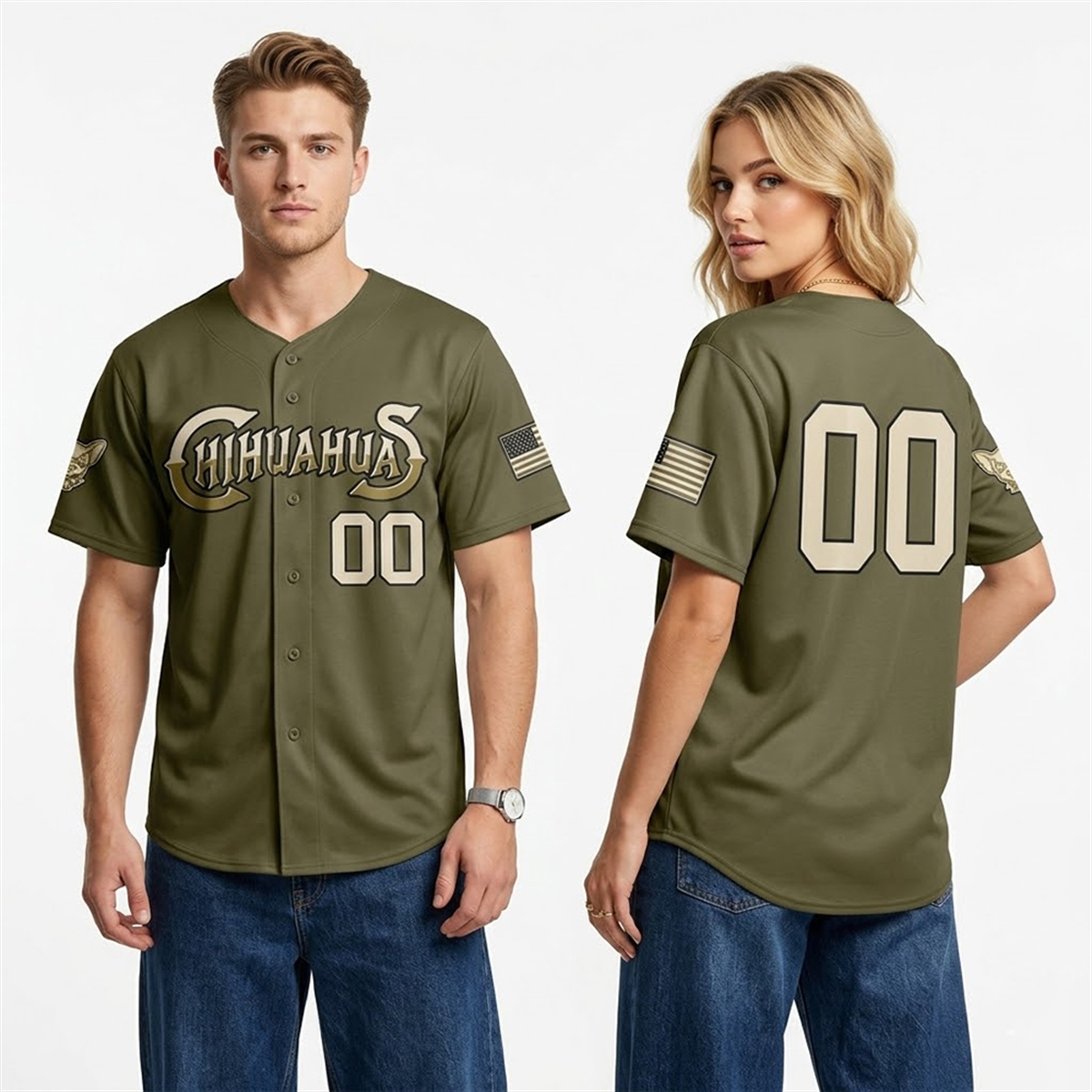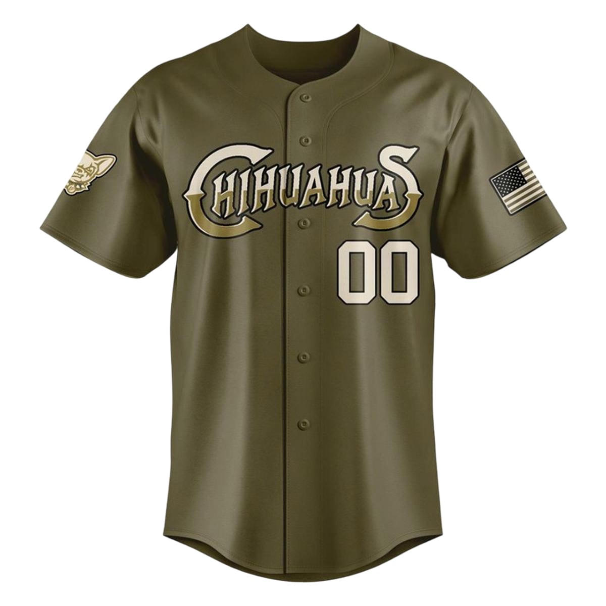 The jersey is a visual triumph that reimagines the traditional baseball uniform through a lens of military appreciation. The base of the jersey utilizes a deep, tactical olive drab green, immediately establishing its purpose and theme. Across the chest, the iconic “CHIHUAHUAS” team script is rendered in a stylized, aggressive font, outlined in contrasting tan and gold tones that pop against the dark background.