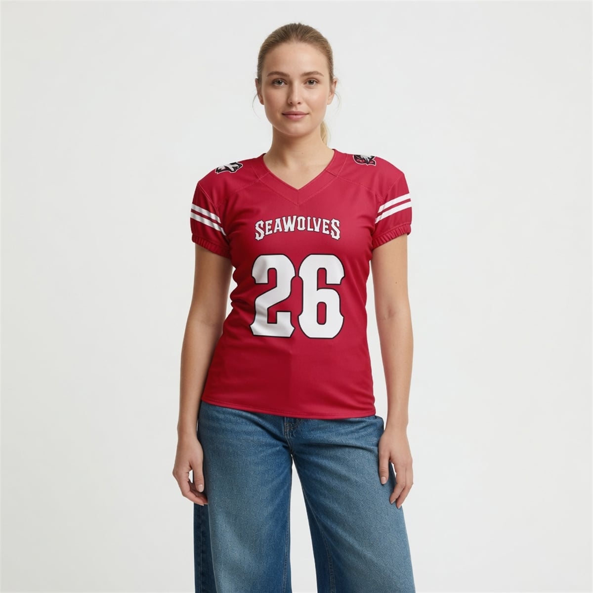 The jersey represents a brilliant intersection of sports cultures. Traditionally known for their presence on the baseball diamond, the SeaWolves have reimagined their iconic branding onto a classic football silhouette. The jersey features a vibrant red base color, complemented by bold, contrasting white numbering and lettering. The word “SEAWOLVES” arches proudly across the chest, positioned just above the prominent number “26,” which is replicated in a larger format on the back. The shoulders are adorned with the team’s fierce wolf logo, creating a powerful and intimidating visual profile. This item was created as a promotional centerpiece, designed to reward loyal fans and create a completely unique atmosphere at the stadium.