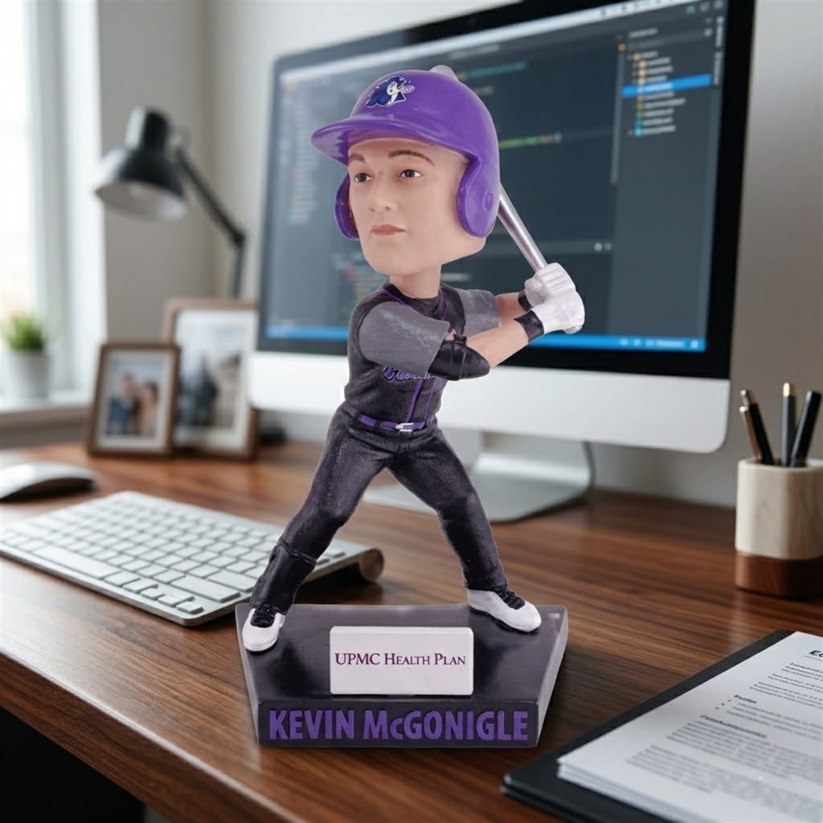 This bobblehead features top prospect Kevin McGonigle in a dynamic, game-ready batting stance. Dressed in the striking Erie SeaWolves “Moon Mammoths” alternate uniform, the figure showcases a sleek charcoal and black jersey accented with vibrant purple piping. McGonigle sports a bright purple batting helmet adorned with the iconic Moon Mammoths logo, paired perfectly with black pants, crisp white batting gloves, and matching cleats. He stands firmly on a dark-colored, home-plate-inspired base that prominently displays his name in bold purple lettering. Just above his nameplate, a sharp white sign features the logo of the giveaway’s sponsor, UPMC Health Plan.