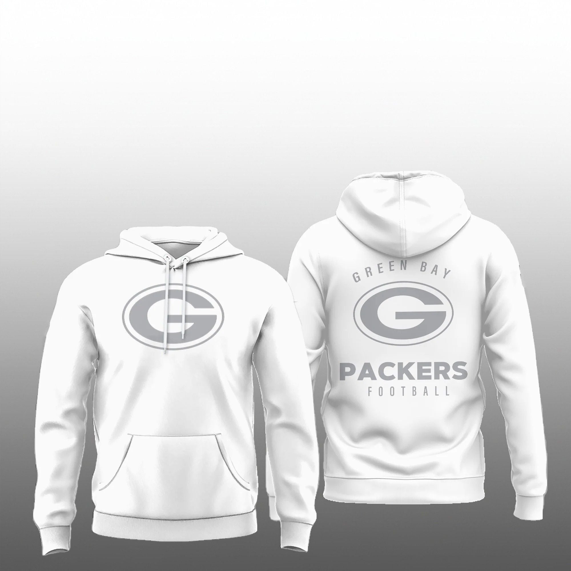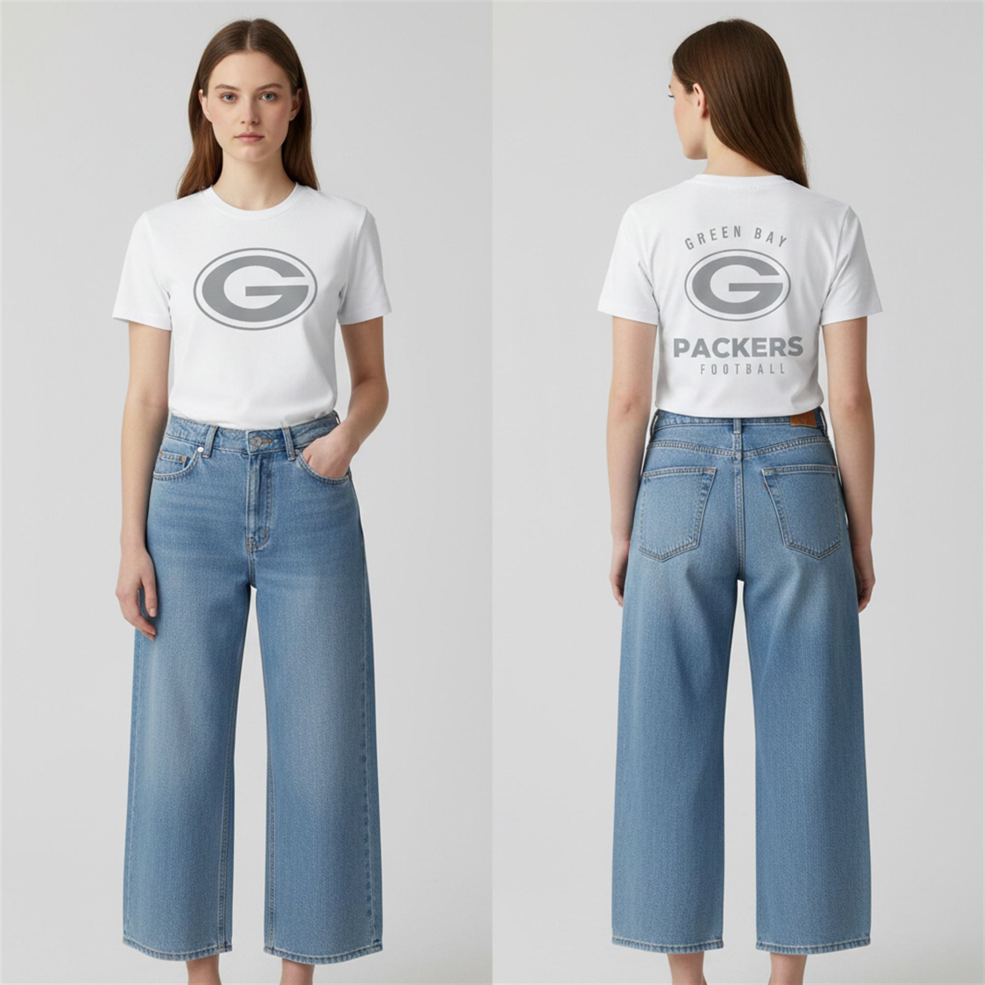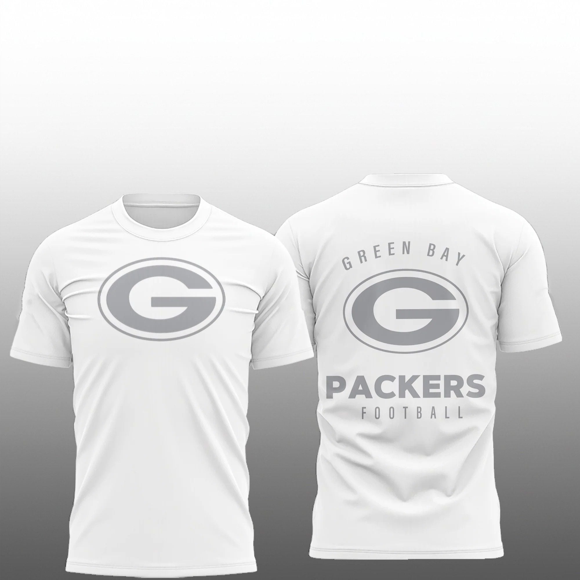 Visually, the shirt embraces a clean, ultra-modern aesthetic. It features a pristine white base that serves as the perfect canvas for the graphics. The center chest displays the iconic “G” logo, reimagined in a sleek, monochromatic silver-grey tone. Above the logo, “GREEN BAY” is arched in a classic varsity font, while “PACKERS FOOTBALL” anchors the design below. The back mirrors this impactful imagery with an oversized print, ensuring your allegiance is visible from every angle in the stadium.