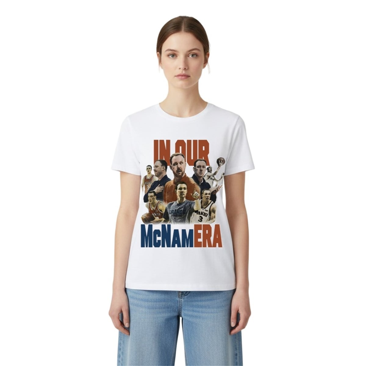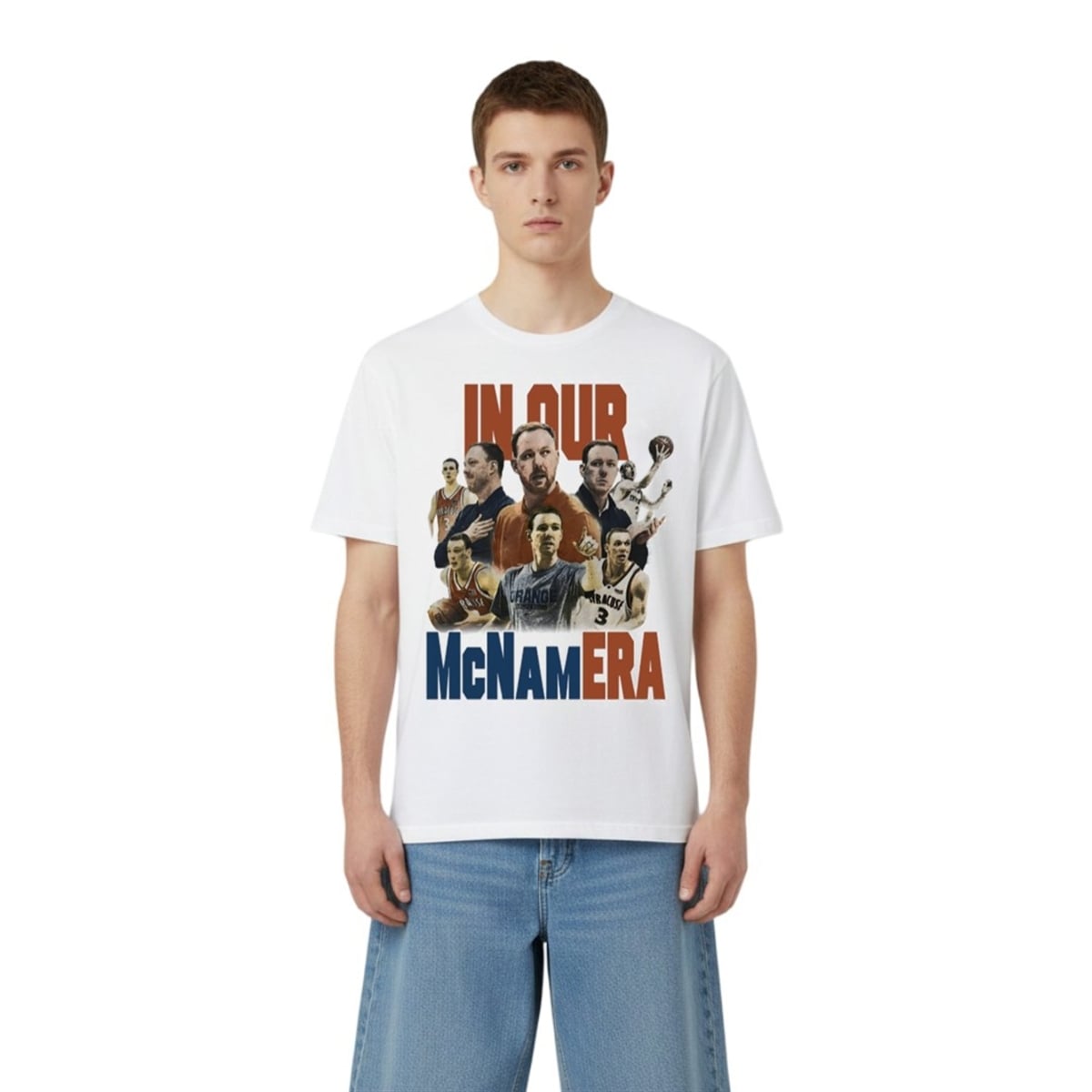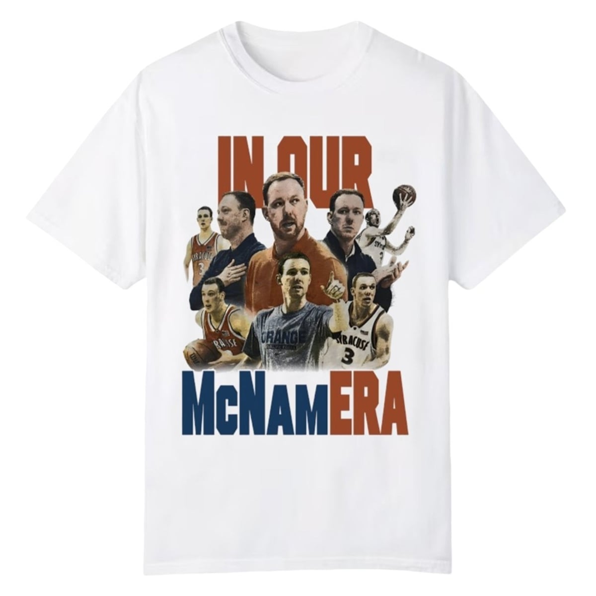 The tee is a visual celebration of basketball heritage, combining dynamic sports photography with modern typography. The design features a compelling collage of Gerry McNamara across different stages of his illustrious career, from his intense playing days sinking crucial three-pointers to his focused, authoritative presence as a coach. Anchored by bold, block lettering that playfully spells out “IN OUR McNAMERA,” the visual layout utilizes a striking color palette of deep blues, vibrant oranges, and crisp whites. This aesthetic mastery ensures the piece stands out in any crowd, offering a bold visual statement that moves beyond traditional, team logos to offer something much more personalized and culturally relevant to the basketball community.
