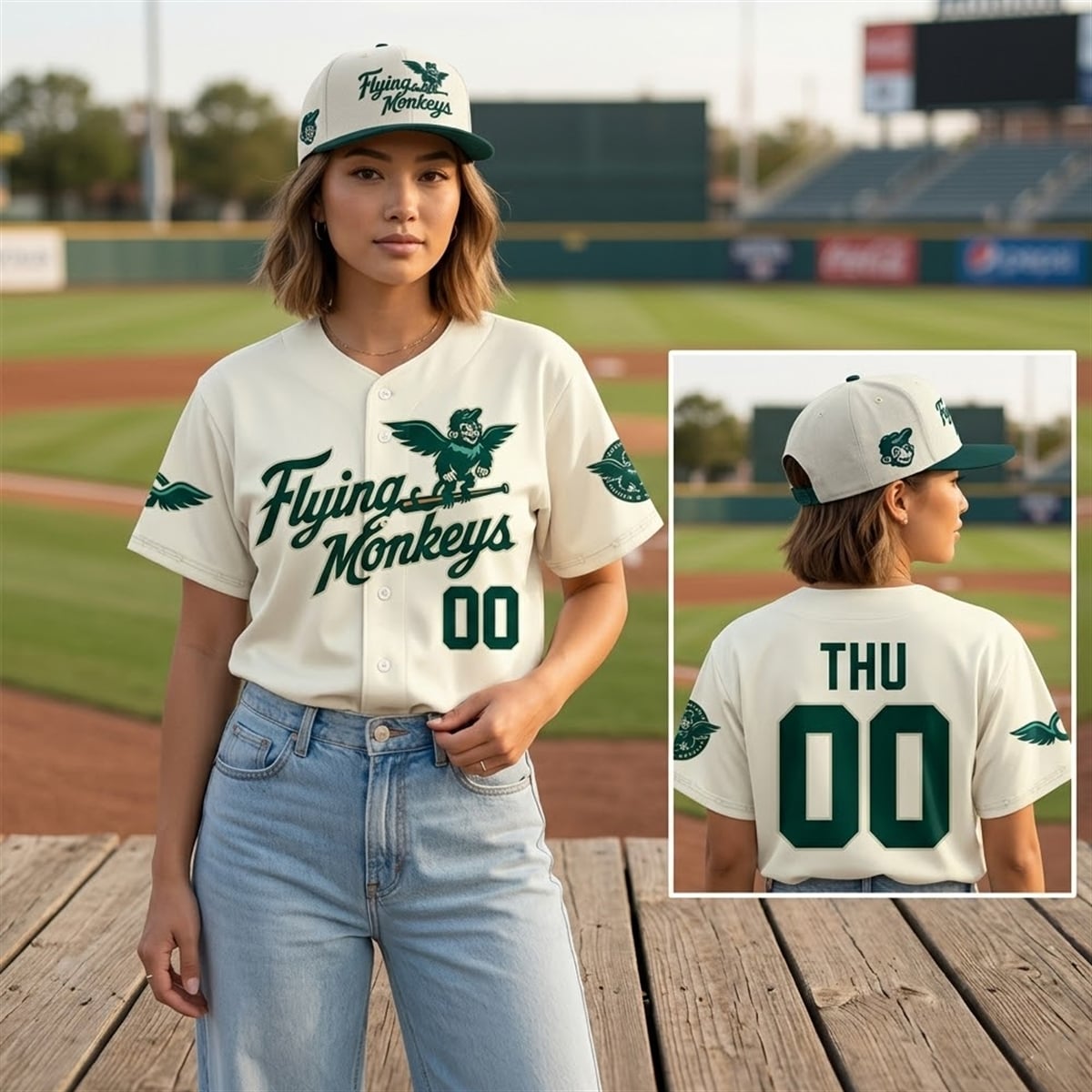 The jersey is a visual masterpiece that brilliantly fuses the charm of traditional baseball apparel with a clever twist of legendary fantasy. Showcasing a pristine, vintage-inspired cream base, the front is proudly emblazoned with an elegant, sweeping script that reads “Flying Monkeys” in a deep, striking emerald green. Hovering just above the text is a fiercely determined winged monkey mascot confidently gripping a baseball bat, ready to knock it out of the park. Small, matching monkey logos adorn the sleeves for an authentic athletic team feel. The back of the garment offers a completely customizable canvas, allowing you to proudly display your chosen name and a two-digit number in bold, block-style emerald lettering. It is a striking visual statement that bridges the gap between competitive sports identity and imaginative flair.