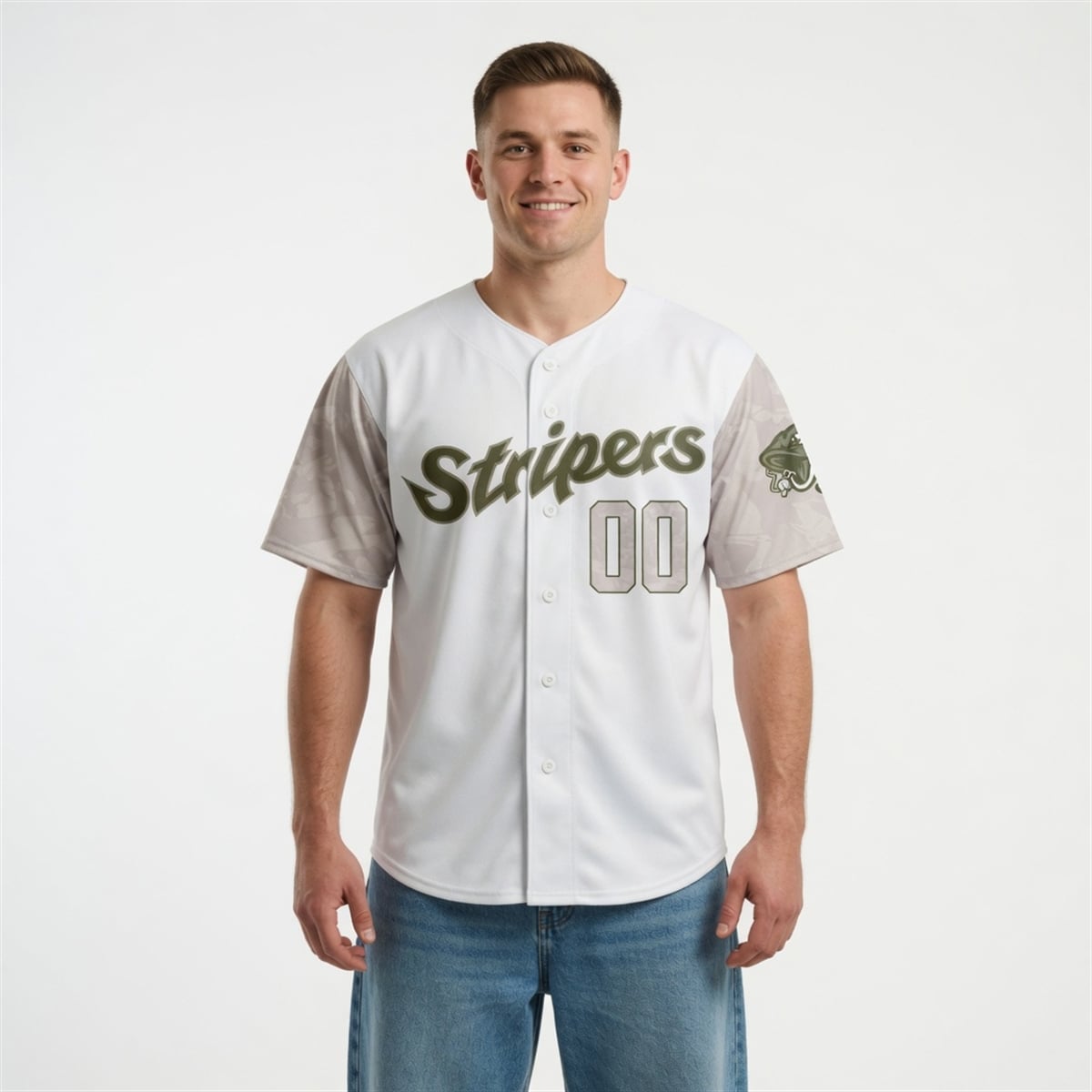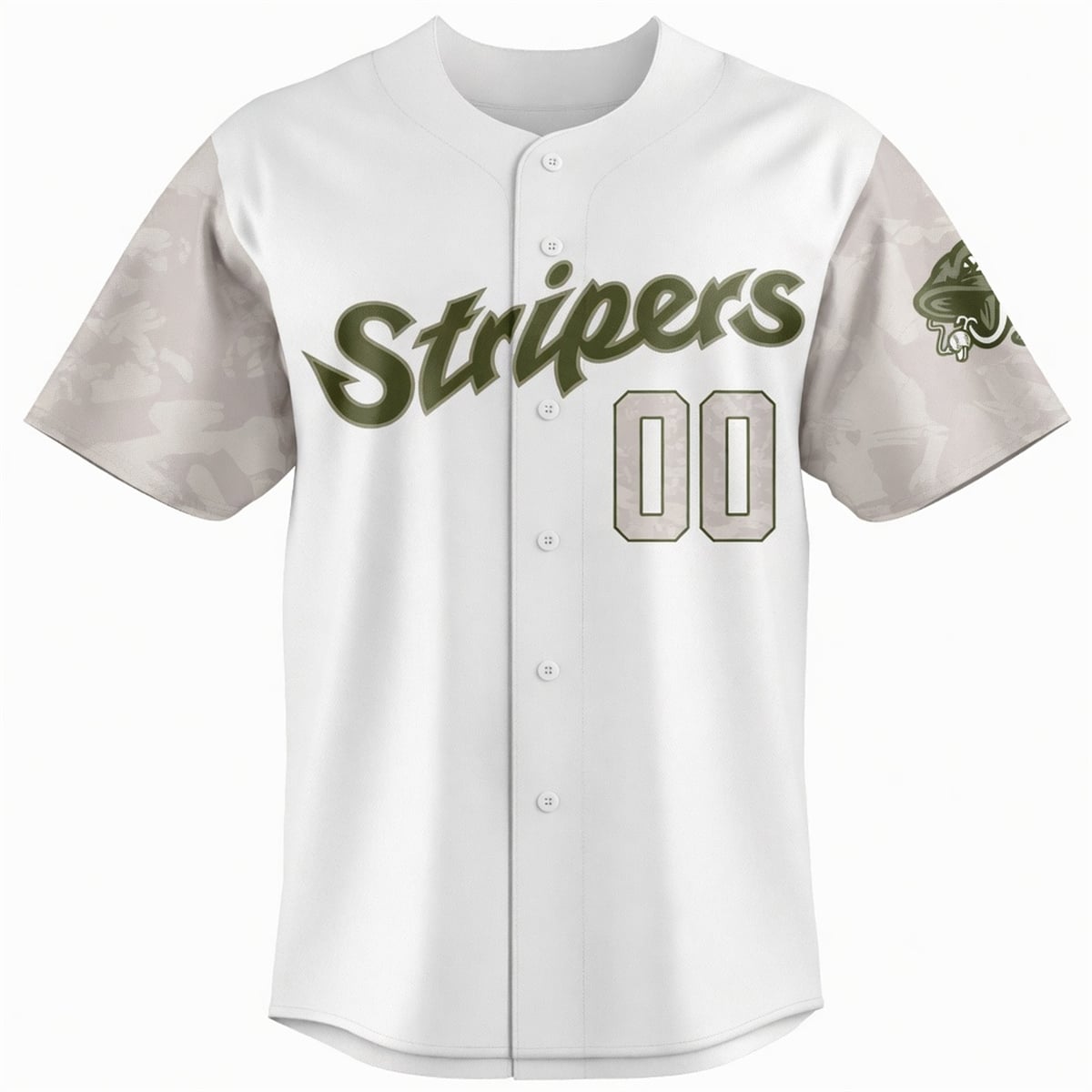 The jersey is a specialty promotional item designed to celebrate military personnel through the lens of minor league baseball. The visual design completely reimagines the traditional Stripers aesthetic. The front features a crisp, clean white base adorned with the “Stripers” team moniker written in a striking, tactical olive green script. The most prominent design features are the sleeves, which showcase a subtle, stylized camouflage pattern that seamlessly blends athletic wear with military inspiration. On the back, fans have the ultimate freedom of personalization. The design accommodates a large two-digit number and custom nameplate lettering, rendered in a matching camo-fill with olive green outlining.