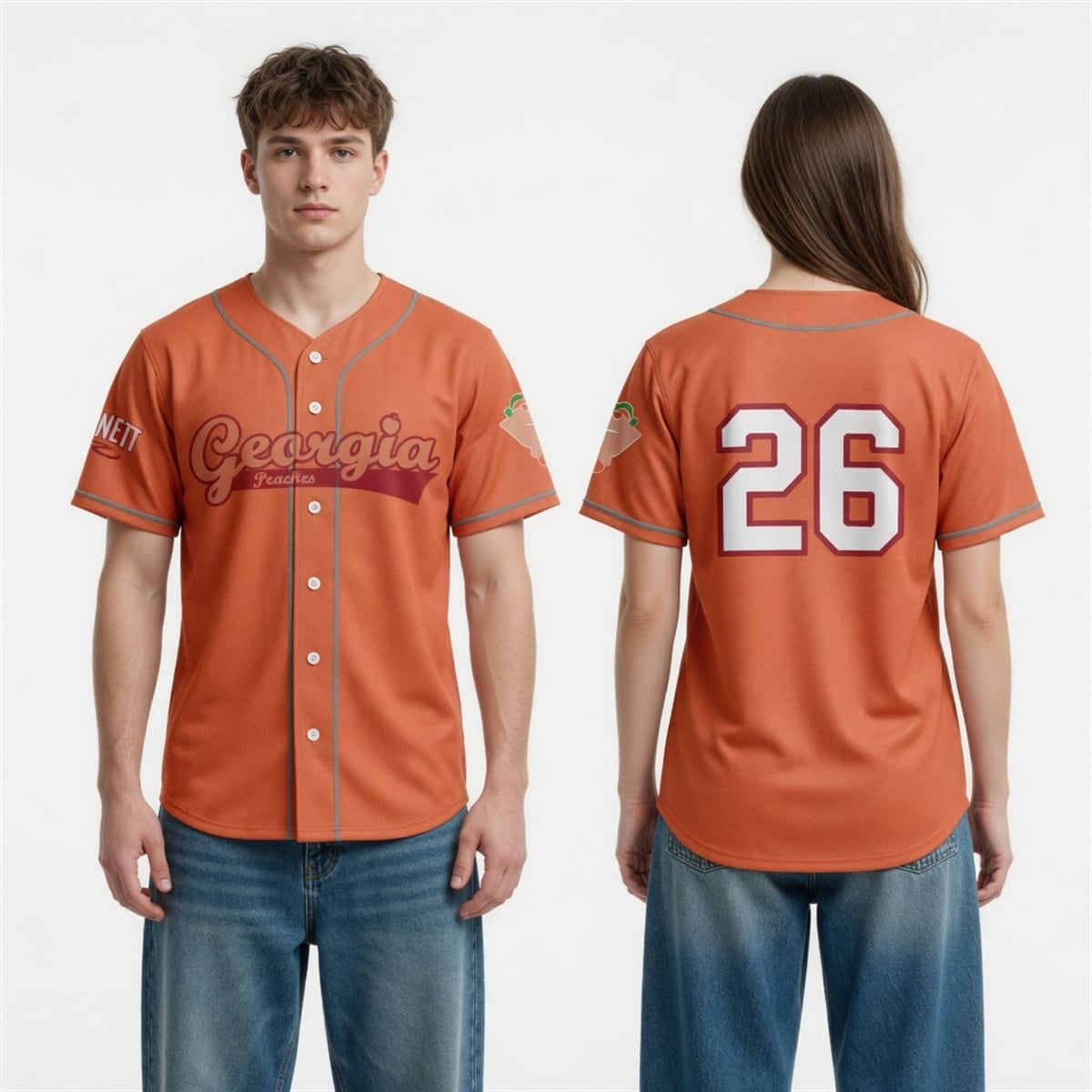 Visually, this commemorative jersey is a standout. The design features a striking orange base color that immediately draws the eye, offset by classic, contrasting grey piping down the front closure and around the sleeves. Across the chest, the elegant “Georgia Peaches” script logo evokes a sense of nostalgia, perfectly capturing the essence of vintage baseball aesthetics. The sleeves proudly display secondary visual markers, including the Gwinnett team logo on the right and a charming peach graphic on the left. The back is emblazoned with a bold, block-style number “26,” permanently cementing this item’s association with the historic 2026 baseball season.