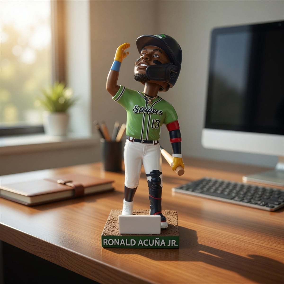 The bobblehead immortalizes the dynamic outfielder during a crucial stepping stone in his career. The figure depicts Acuña Jr. standing poised on a dirt-textured base, stationed right behind a pristine home plate. He is wearing the signature green Gwinnett Stripers alternate jersey with “Stripers” scripted across the chest and his iconic number 13 displayed prominently.