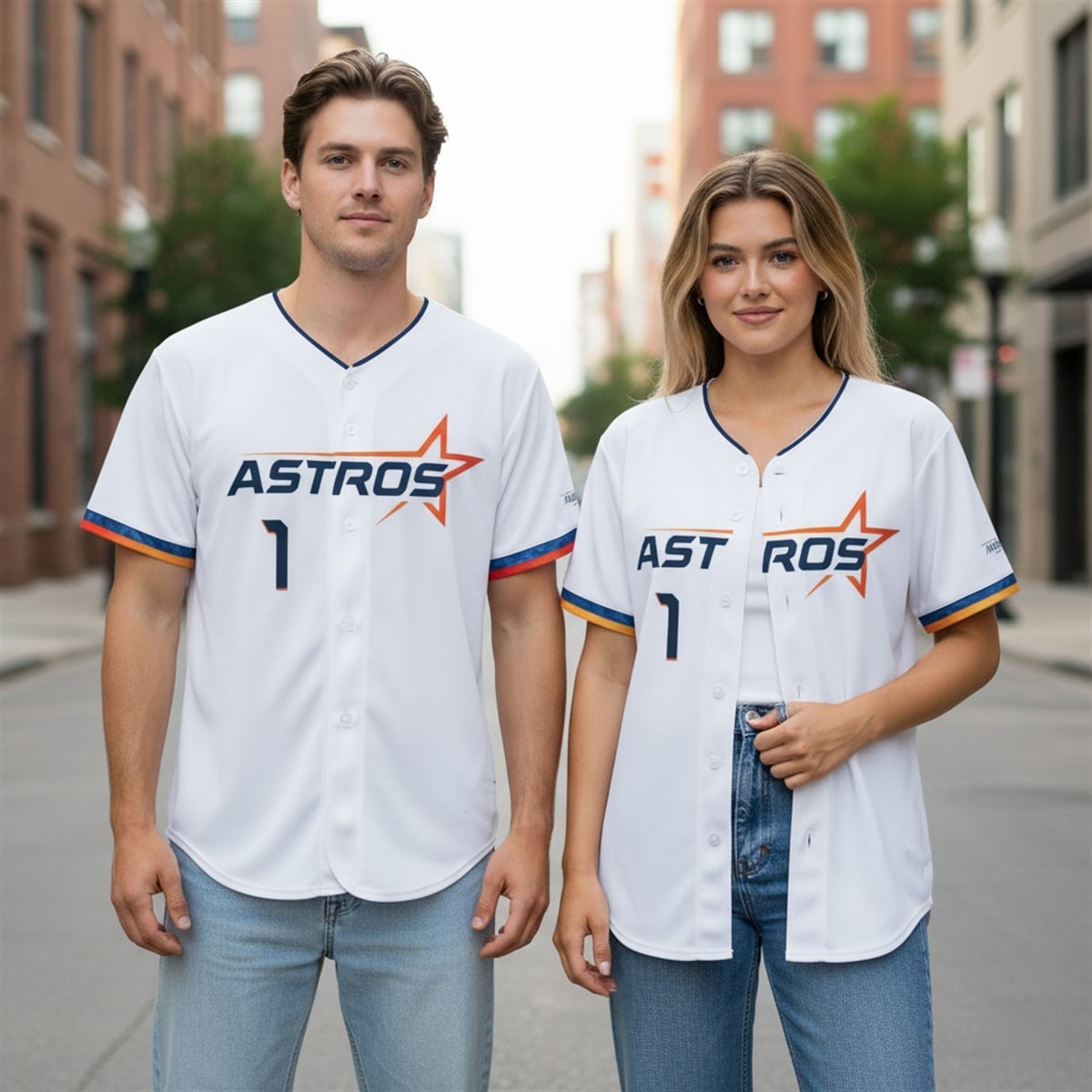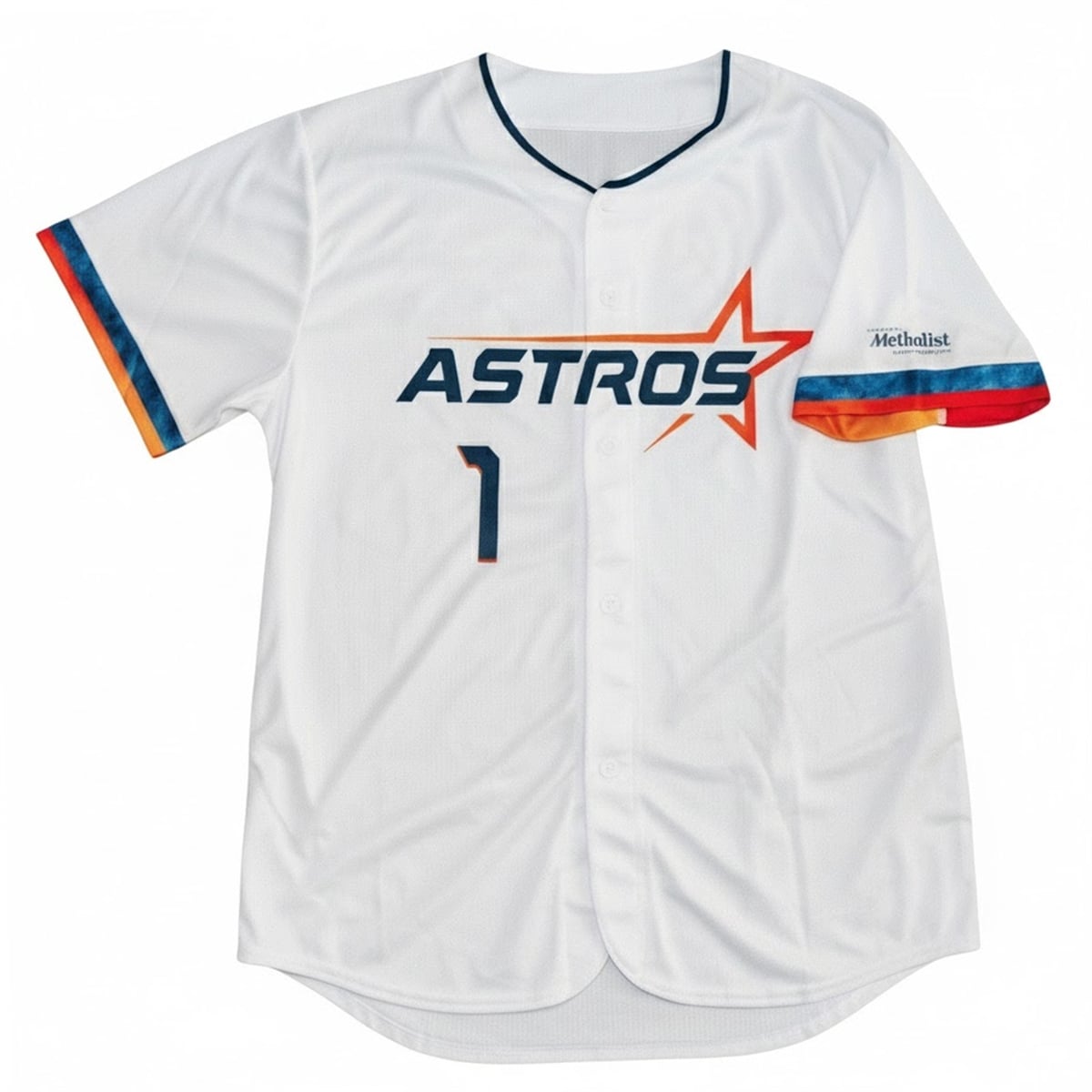 The jersey is a stunning visual tribute to both a franchise icon and the city’s cosmic heritage. Featuring a pristine white base, the design is aggressively highlighted by the signature navy blue and vibrant orange “ASTROS” wordmark slashed dynamically across the chest. The bold number “1” sits proudly below, instantly invoking memories of electrifying plays at shortstop. What truly sets this specific giveaway piece apart are the striking sleeve details. The gradient banding on the cuffs—transitioning through deep blues, vibrant teals, and fiery oranges—pays direct homage to Houston’s “Space City” campaign and its ties to aerospace exploration. Additionally, the inclusion of the sponsor patch on the sleeve adds an authentic, field-ready aesthetic to the overall visual presentation.