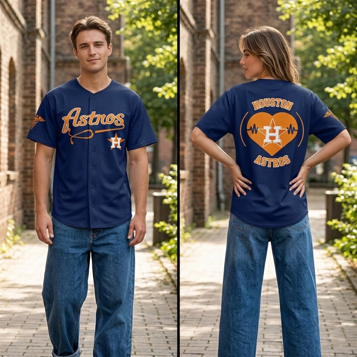 The jersey is a visually captivating piece of commemorative sports apparel. Set against a deep, classic navy blue background, the front of the jersey features the iconic “Astros” script in vibrant team orange. However, this edition replaces the traditional underline with a cleverly integrated stethoscope design that loops seamlessly into the lettering. The classic ‘H‘ star logo sits proudly on the lower left. Turning the piece over reveals a massive, eye-catching back graphic: a brilliant orange heart intercepted by an EKG heartbeat line, perfectly framing the Astros star logo in the center, flanked by “HOUSTON” and “ASTROS” in bold varsity lettering. A subtle medical caduceus emblem on the right sleeve completes this masterfully designed tribute.