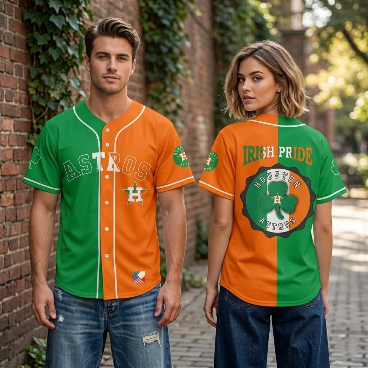 The jersey is a visually captivating piece of sports memorabilia that breaks away from traditional team colorways. Featuring a dramatic half-green and half-orange split design, this item reimagines the classic baseball uniform into a vibrant canvas of cultural celebration. The front proudly displays the recognizable “ASTROS” wordmark in a crisp, hollow-letter style, accompanied by the signature Houston star logo. The back features a large, detailed crest framing a shamrock and the Astros’ ‘H’, topped with an arched “IRISH PRIDE” banner.