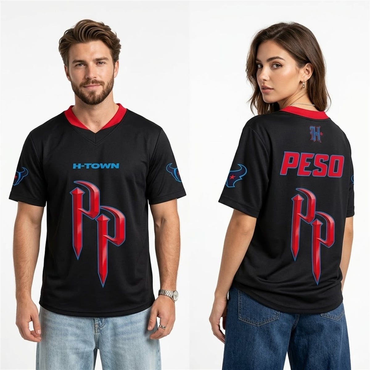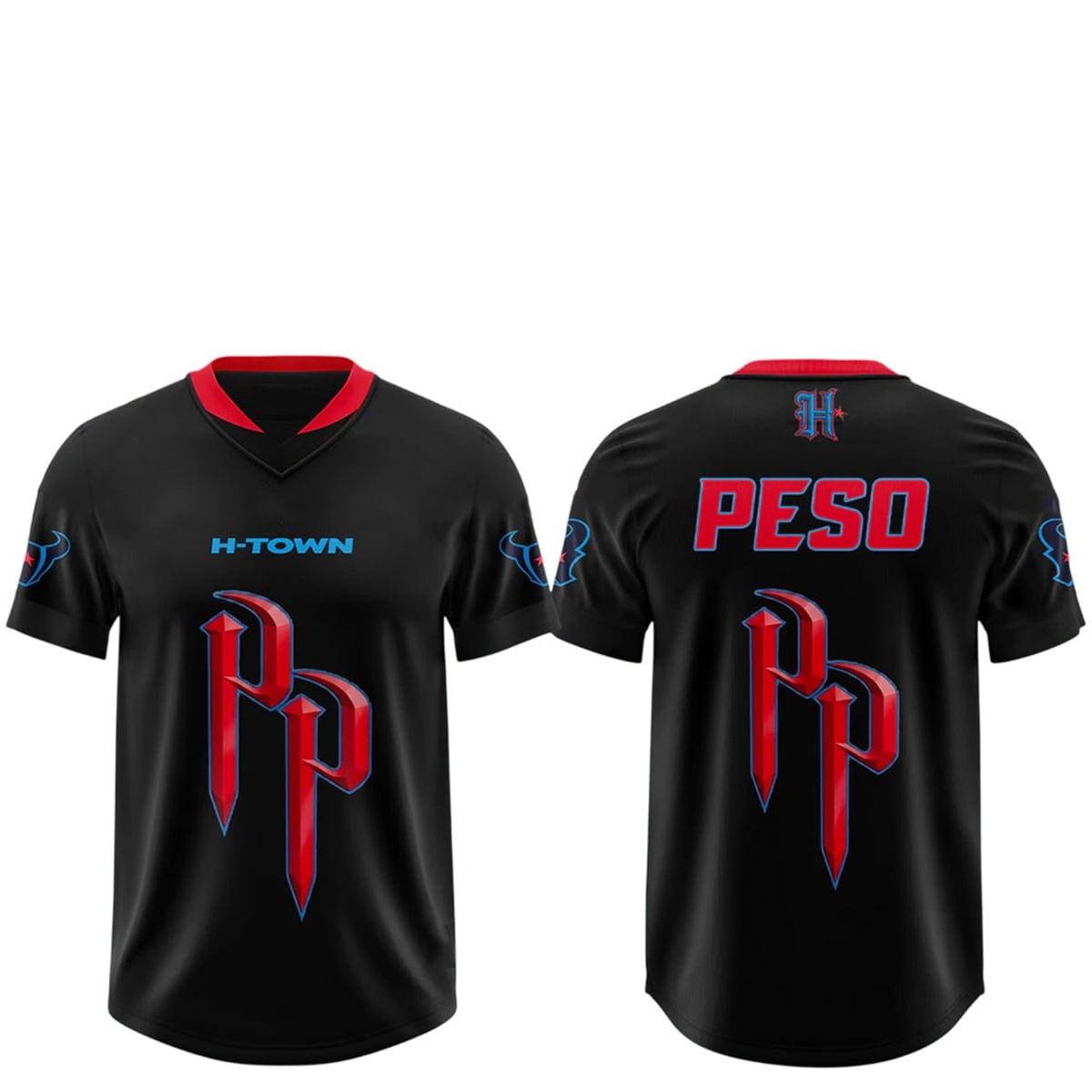 On the sleeves, the traditional Houston Texans bull logo is proudly displayed, grounding the piece in its roots. The back of the jersey is just as commanding as the front, featuring the name “PESO” in large red block lettering with a light blue outline, positioned above a second, oversized “PP” insignia. A specialized, intertwined “H” logo sits at the nape of the neck, completing the detailed aesthetic. This item strips away the traditional athletic look in favor of an edgy, concert-ready vibe.