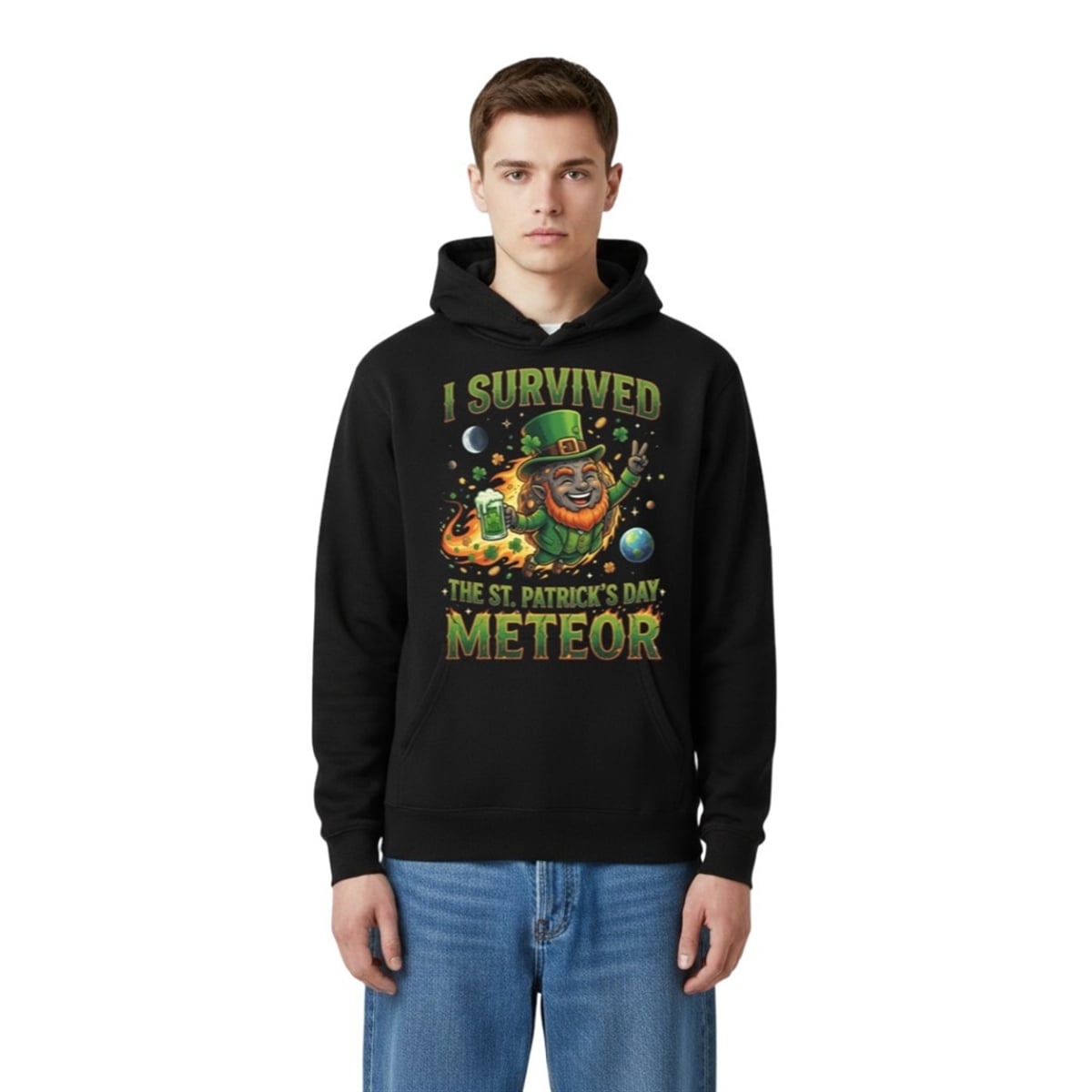 The cosmic background is peppered with floating green shamrocks, glowing stars, and tiny planets, creating a surreal and hilarious juxtaposition. Bold, block-style typography frames the illustration, with “I SURVIVED” arching across the top in distressed, neon-green lettering, and “THE ST. PATRICK’S DAY METEOR” anchoring the bottom in fiery, dynamic text. The dark background of the item allows the vibrant greens, fiery oranges, and cosmic blues of the graphic to pop intensely, making the entire visual narrative completely unmistakable from across the room.