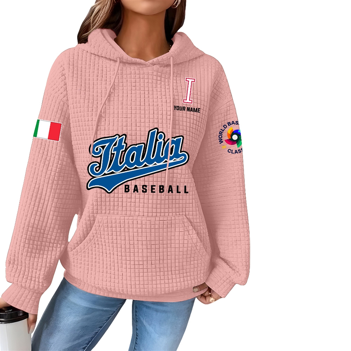 The Waffle Hoodie is a highly distinct piece of fan apparel designed to celebrate one of the most exciting events in global sports. Visually, the hoodie stands out with a unique, grid-like textured pattern presented in a striking pink hue. The front chest proudly displays a dynamic “Italia Baseball” script logo in a bold, athletic font, immediately identifying your team allegiance.
