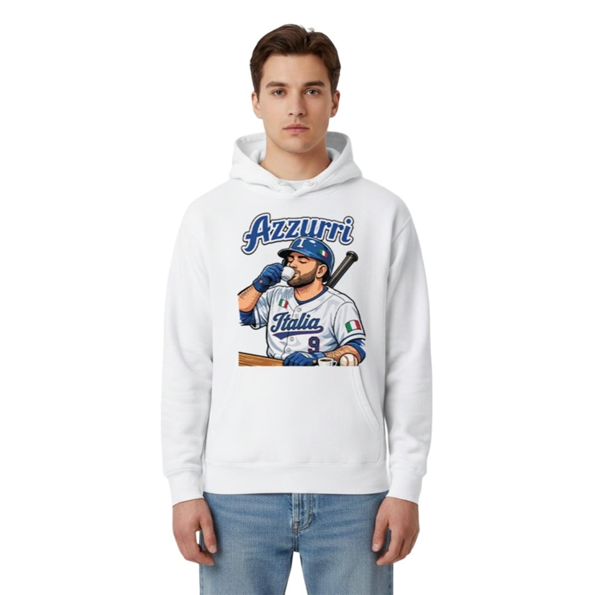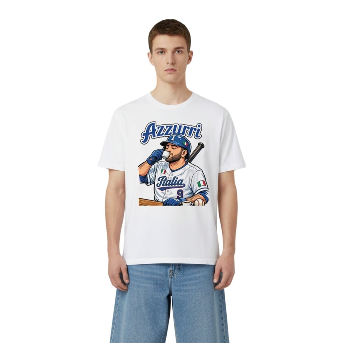 The shirt is a bold tribute to the undeniable swagger of Team Italy’s unforgettable World Baseball Classic roster. Featuring a dynamic, comic-book-style illustration of Vinnie Pasquantino wearing his iconic number 9 “Italia” jersey, this apparel captures the exact moment that broke the internet: the post-home run espresso sip. With his batting gloves still on and his bat resting casually on his shoulder, the design perfectly frames the slugger enjoying a tiny cup of espresso beneath the classic “Azzurri” lettering. The vibrant blue and white color palette mirrors the team’s aesthetics, while the flag detailing on the helmet and sleeve adds an authentic touch of global sports pride. This shirt is more than just fan gear; it is a wearable piece of sports history that celebrates the exact moment a beloved dugout ritual became a global sensation.
