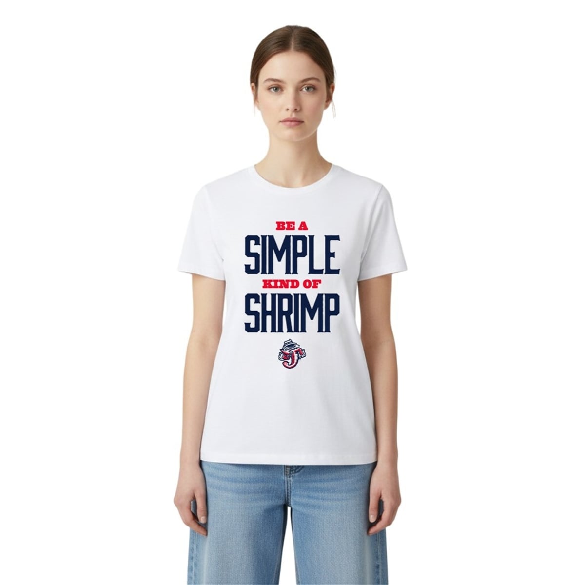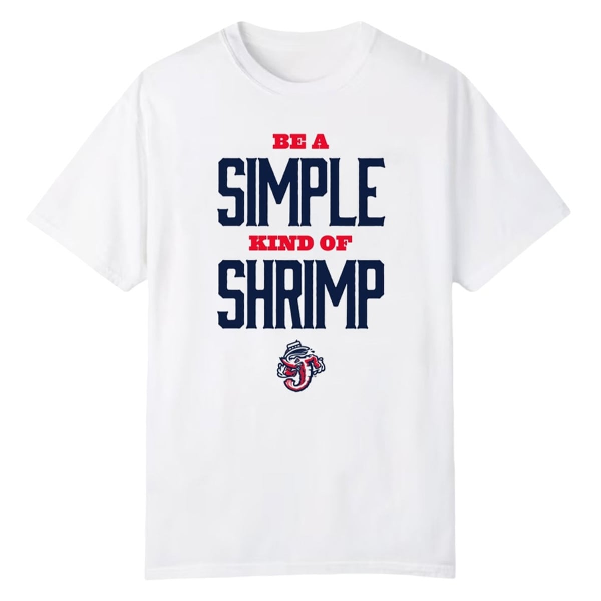 The shirt presents a visually captivating aesthetic that perfectly balances athletic tradition with modern pop-culture merchandising. Set against a clean, stark white background, the front of the garment is dominated by bold, stadium-style typography. The words “SIMPLE” and “SHRIMP” are rendered in a massive, navy blue collegiate block font that demands attention from across the diamond. Intersecting these massive focal words are the phrases “BE A” and “KIND OF,” elegantly styled in a contrasting, bright red serif font. Anchoring the entire typographic design is the iconic Jacksonville Jumbo Shrimp primary logo—a fierce, muscular shrimp gripping the letter “J” while wearing a baseball cap. The visual hierarchy of the design is meticulously crafted to maximize impact, making it a brilliant piece of visual sports marketing.