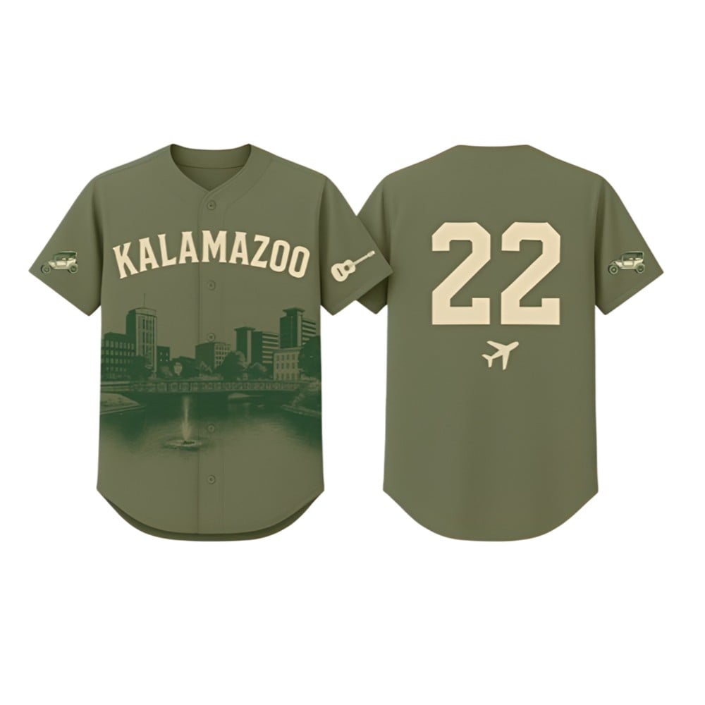 The front of the jersey makes a bold statement with “KALAMAZOO” displayed across the chest in a classic, cream-colored varsity font. But beneath the name lies the jersey’s true heart: a beautifully detailed, two-tone illustration of the Kalamazoo skyline. This graphic captures the city’s architectural spirit, including the iconic fountain in Bronson Park, all set against the backdrop of the Kalamazoo River. It’s an instant badge of honor for anyone with a connection to K-Zoo.