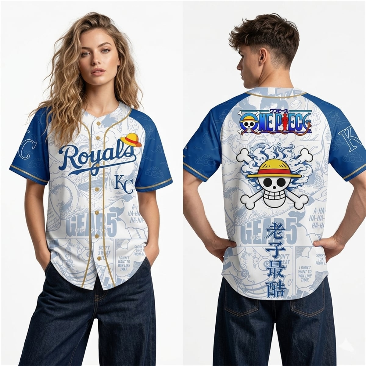 The jersey is a visual masterpiece that completely reimagines traditional sports aesthetics. Drawing heavy inspiration from the climactic “Gear 5” transformations and classic manga paneling, the design intricately weaves iconic anime imagery directly into the visual identity of the Royals.