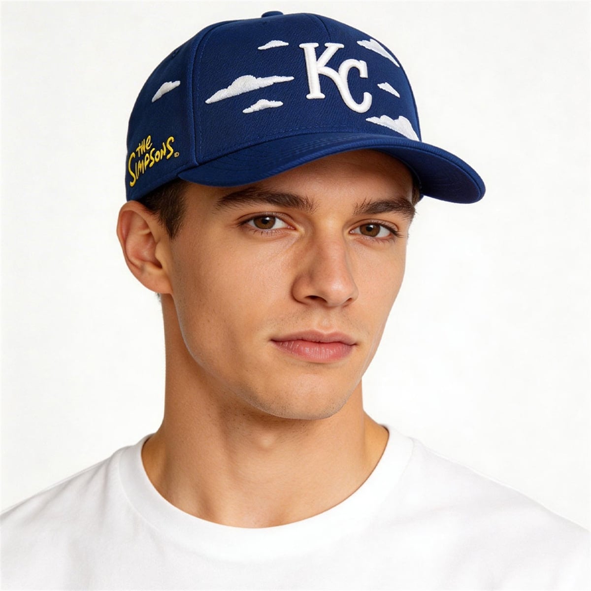 At the center of the cap, the traditional Kansas City Royals “KC” insignia has been entirely reimagined. It is presented in the signature yellow tone and playful, slightly uneven typography characteristic of The Simpsons branding, complete with a bold black outline to make the letters pop against the sky-blue background. On the side panel, the “THE SIMPSONS” wordmark is proudly displayed in its classic font.