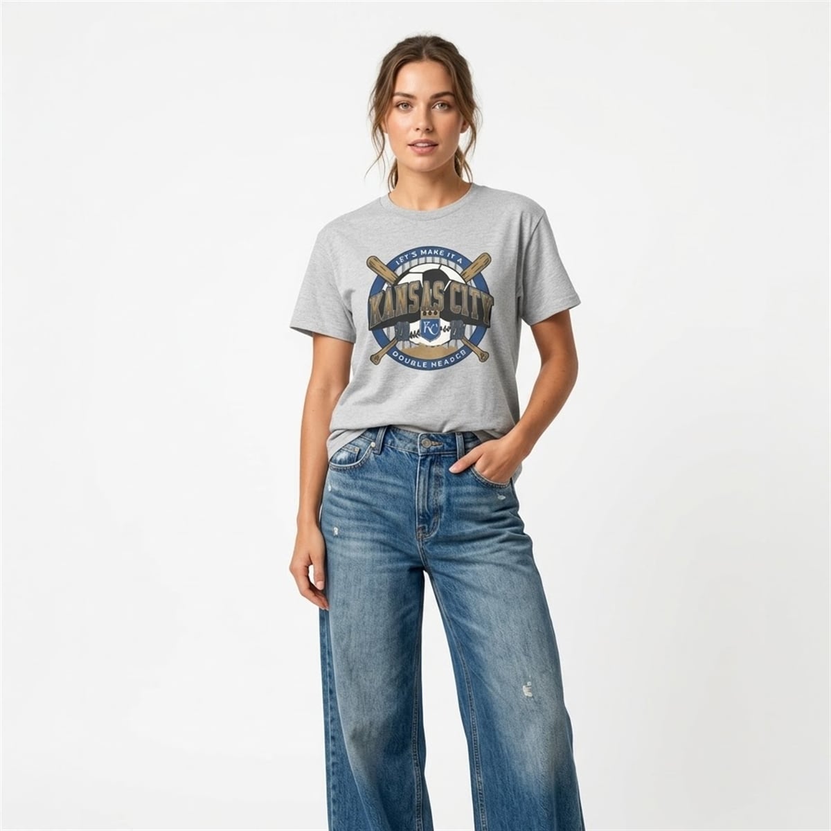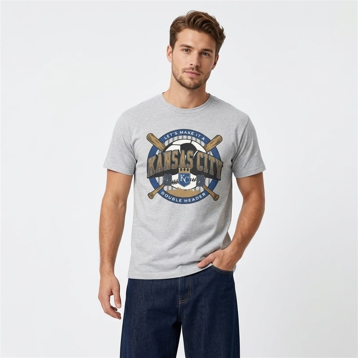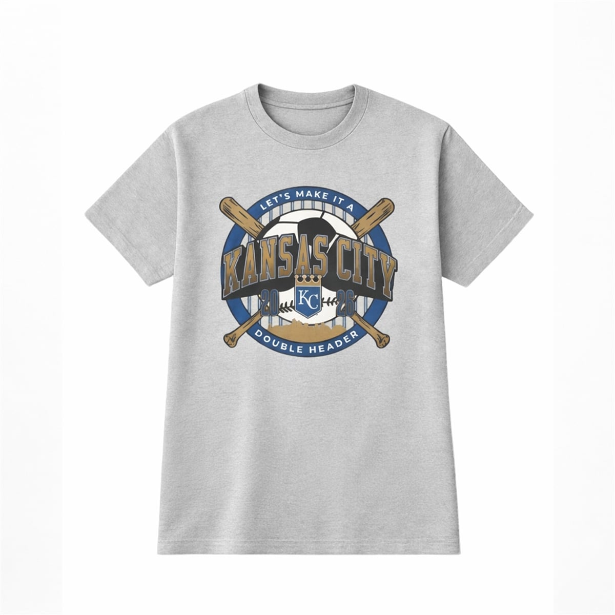 The shirt is a visually dynamic celebration of a legendary day in local sports history. The centerpiece of this item is a meticulously crafted circular crest that boldly proclaims, “Let’s Make It A Kansas City Double Header.” This central graphic is instantly recognizable, anchoring the iconic KC crown logo against a highly creative split-background design. By merging the distinct stitching of a baseball on the bottom half with the unmistakable hexagonal pattern of a soccer ball on the top half, the artwork brilliantly bridges the gap between the diamond and the pitch. Two crossed baseball bats frame the emblem, adding a classic, vintage-inspired touch to a thoroughly modern sports milestone.