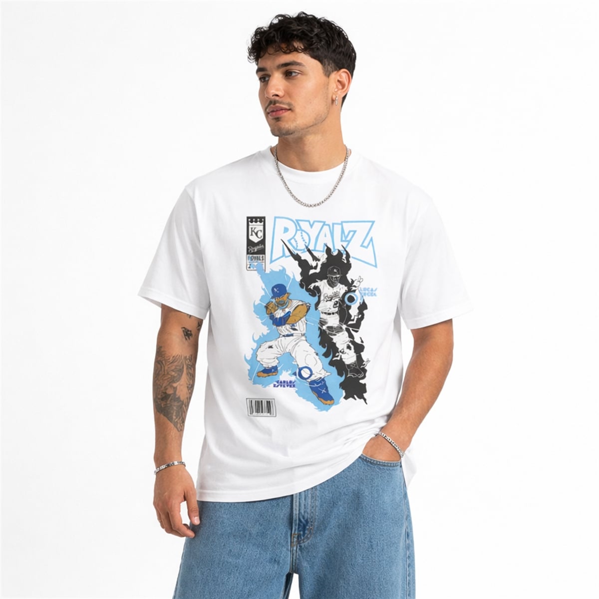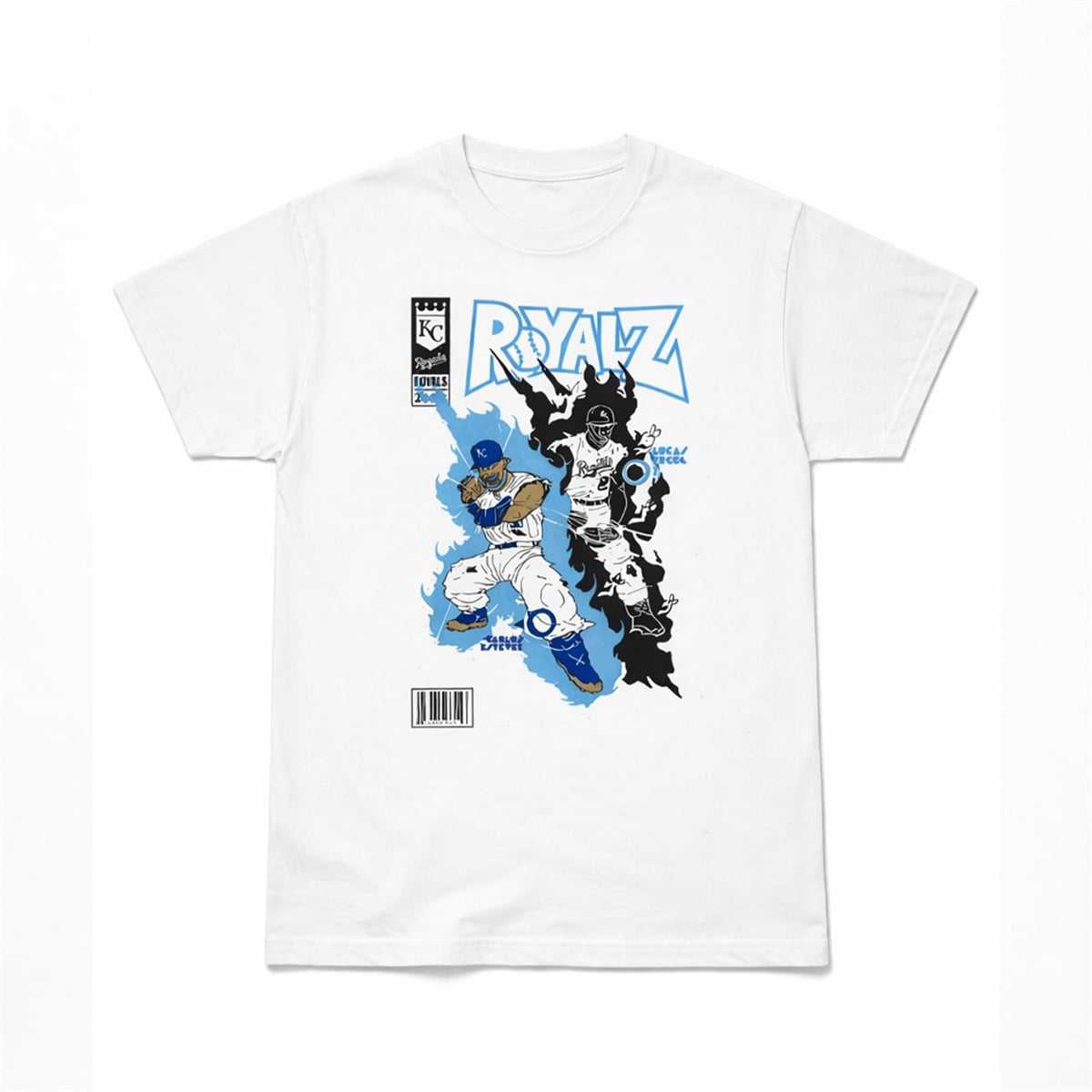 Bold, retro-inspired “ROYALZ” lettering dominates the top of the graphic, perfectly mimicking the title block of a classic 1990s superhero comic. Authentic comic book detailing—including a stylized issue number box in the top left corner and a vintage barcode at the bottom left—completes the illusion. The stark white background allows the vibrant blue accents and deep black contrasts of the player illustrations to visually pop, creating a wearable piece of pop-art that celebrates the thrill of the game.