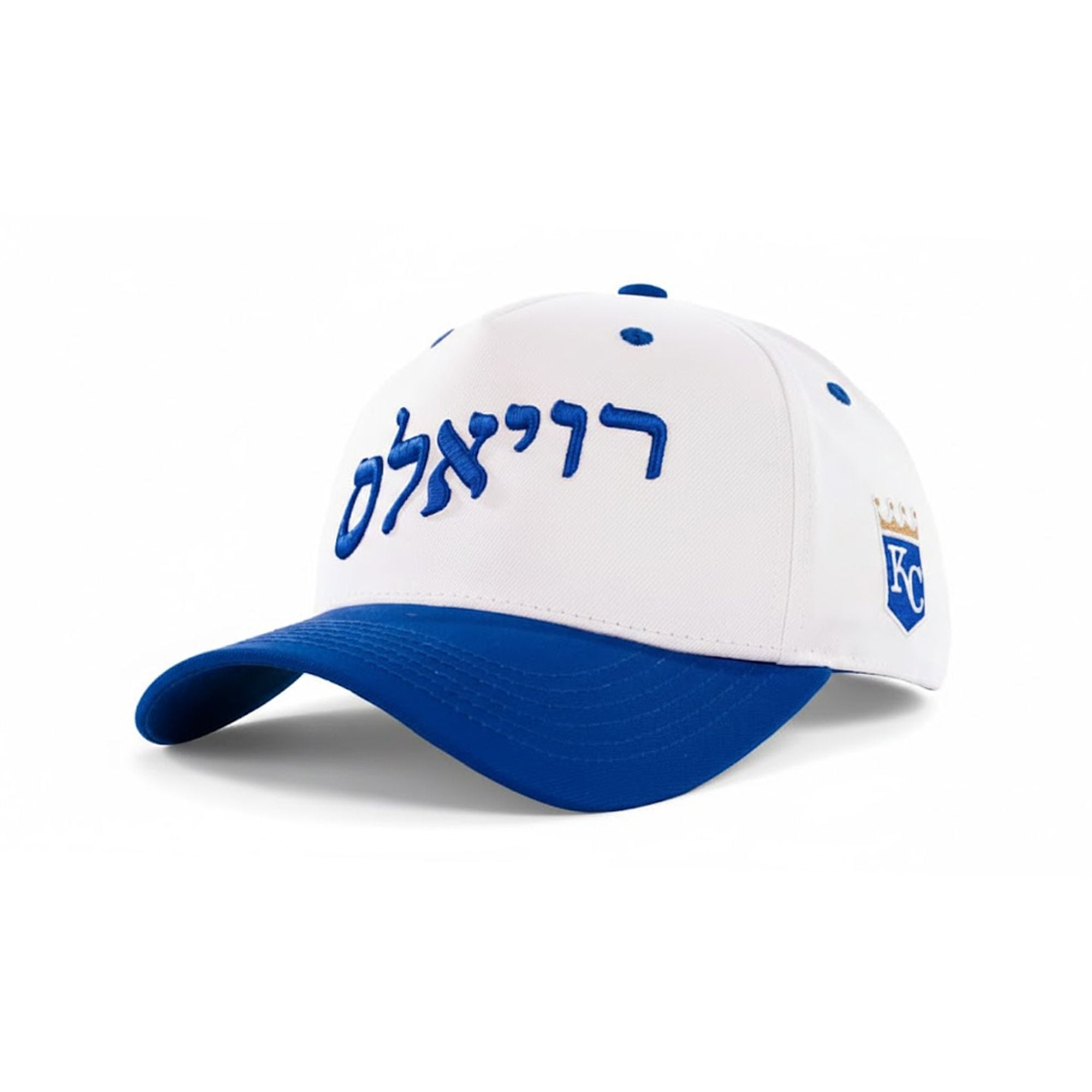 The centerpiece of the design is the front emblem, which proudly displays the word “Royals” translated and stylized in elegant Hebrew lettering (“רויאלס“). This blue phonetic script contrasts beautifully against the white background, drawing the eye and making a powerful cultural statement. Additionally, the side panel features the iconic KC logo complete with its signature golden crown, seamlessly anchoring the design to the beloved Kansas City franchise. This careful balance of classic team branding and unique cultural typography creates a truly groundbreaking piece of sports apparel.