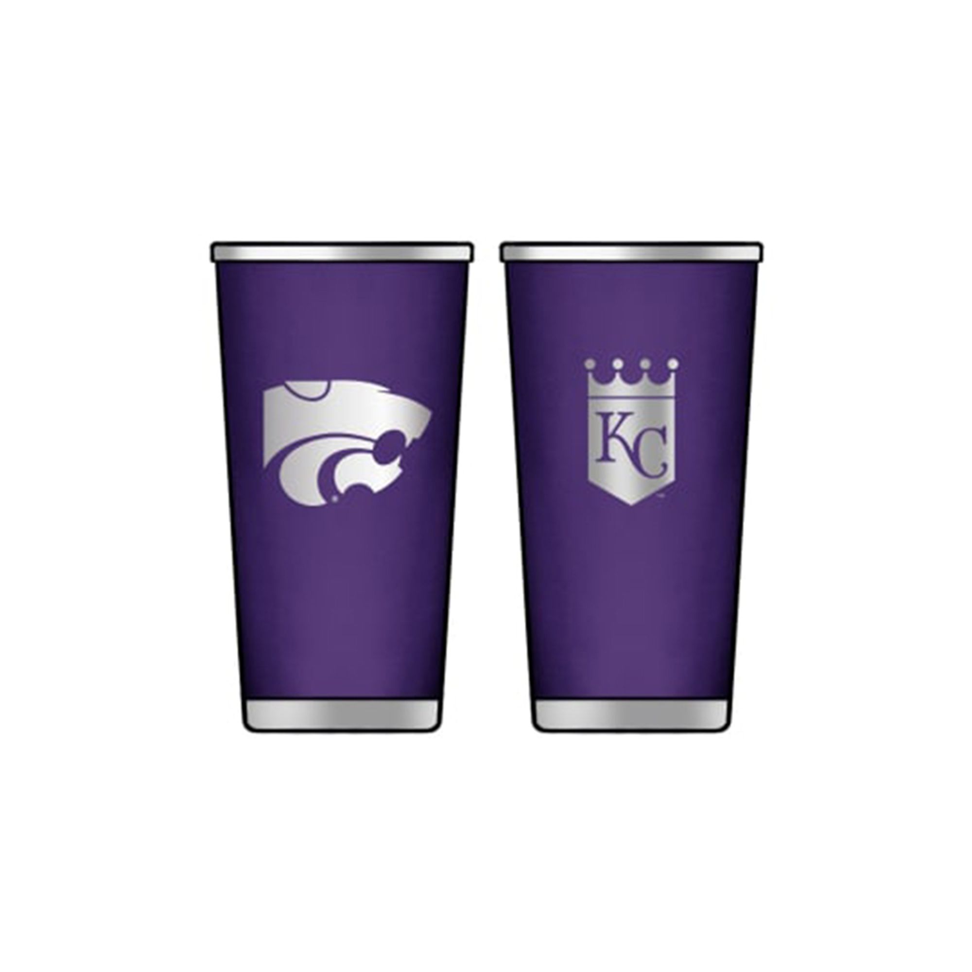 The tumbler is a masterful representation of sports synergy. Bathed in the signature, deep vibrant purple associated with Kansas State University, the tumbler serves as a striking visual canvas. On one side, the iconic K-State Powercat logo is proudly displayed, instantly recognizable to any fan of the Wildcats. Rotate the piece, and you are greeted by the legendary Kansas City Royals “KC” crown logo. Both emblems are rendered in a sleek, contrasting silver tone that pops brilliantly against the purple background. The minimalist yet bold aesthetic ensures that the logos take center stage, creating a perfect harmony between collegiate tradition and professional baseball legacy.