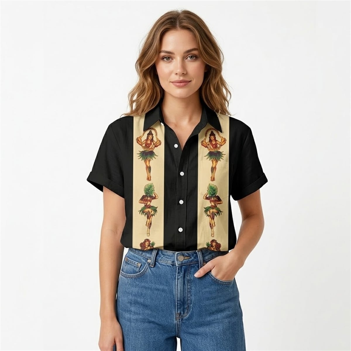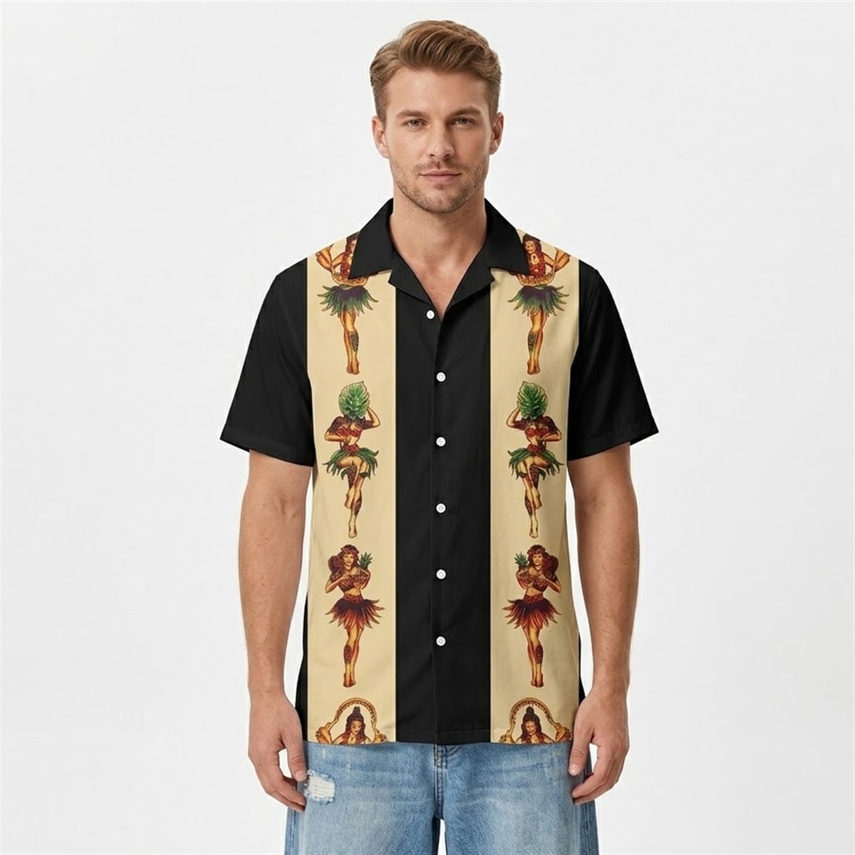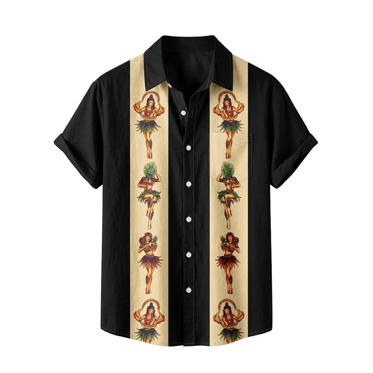 The shirt is a masterclass in contrasting visual aesthetics. Featuring a sleek, pitch-black base, the garment is defined by two bold, beige vertical panels running down the front. Nestled within these vintage-inspired panels is a repeating motif of classic hula dancers, bringing a distinct retro-resort charm to a modern silhouette.