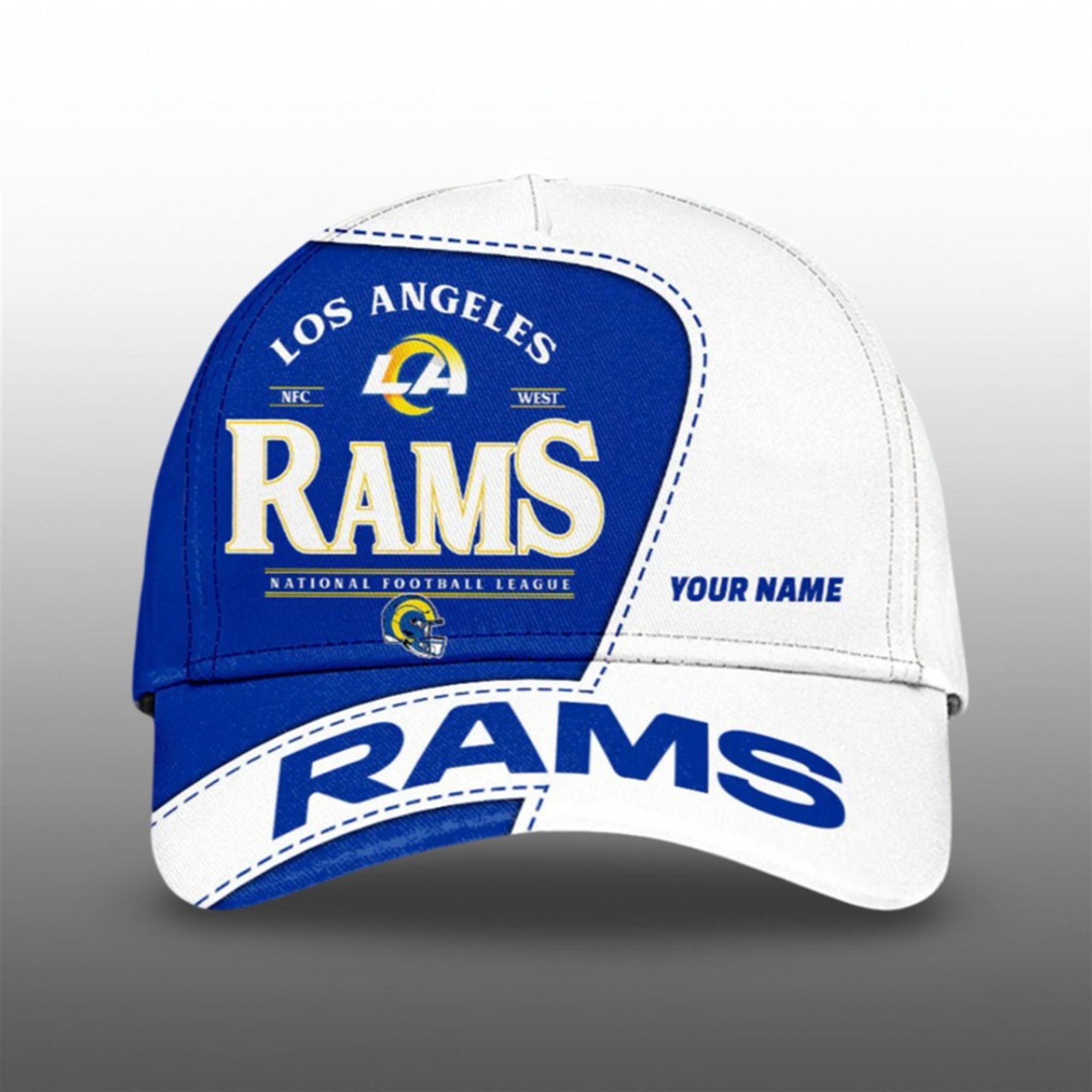 Crafted from a durable, breathable polyester-cotton blend, this structured 6-panel cap features a dynamic two-tone design. The left panel showcases a crisp white finish with your personalized text, while the right panel immerses you in the deep “Rams Royal” blue, highlighted by the team Rams logo and championship text. The iconic Rams horn graphic wraps aggressively around the brim, giving the hat a sense of motion and speed that mirrors the team’s on-field performance.