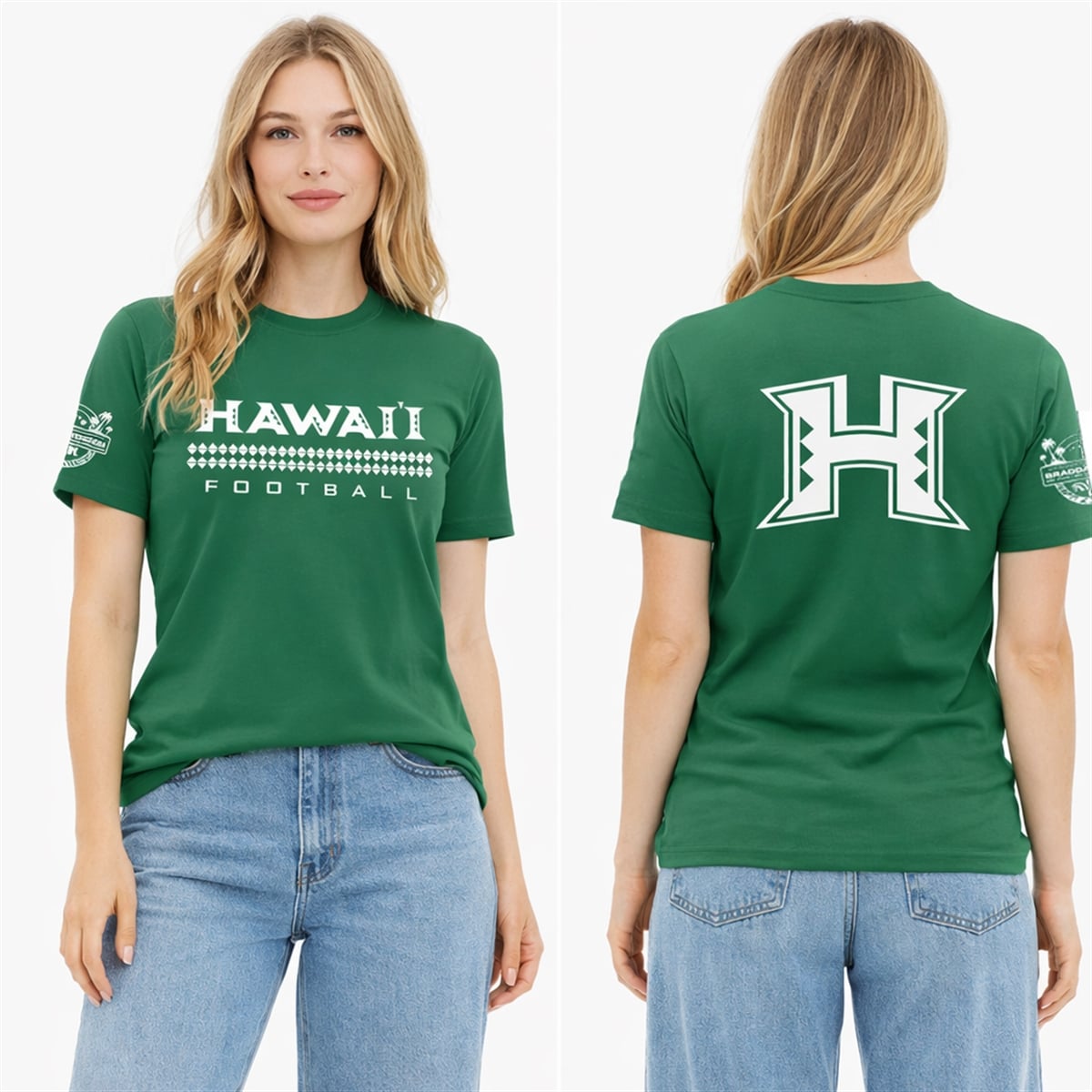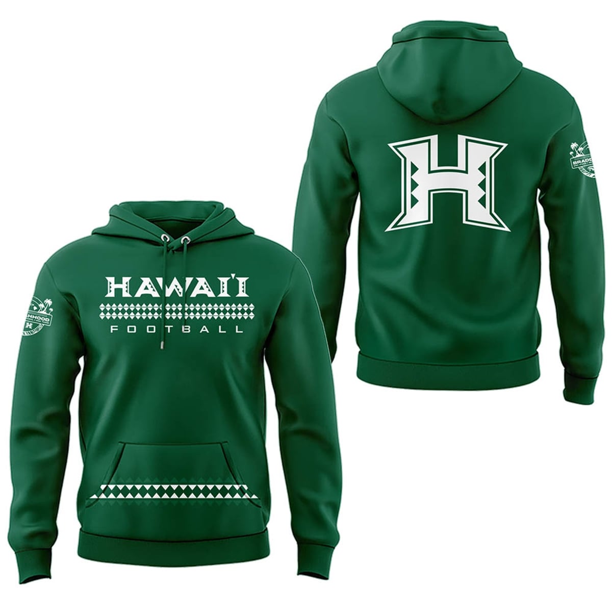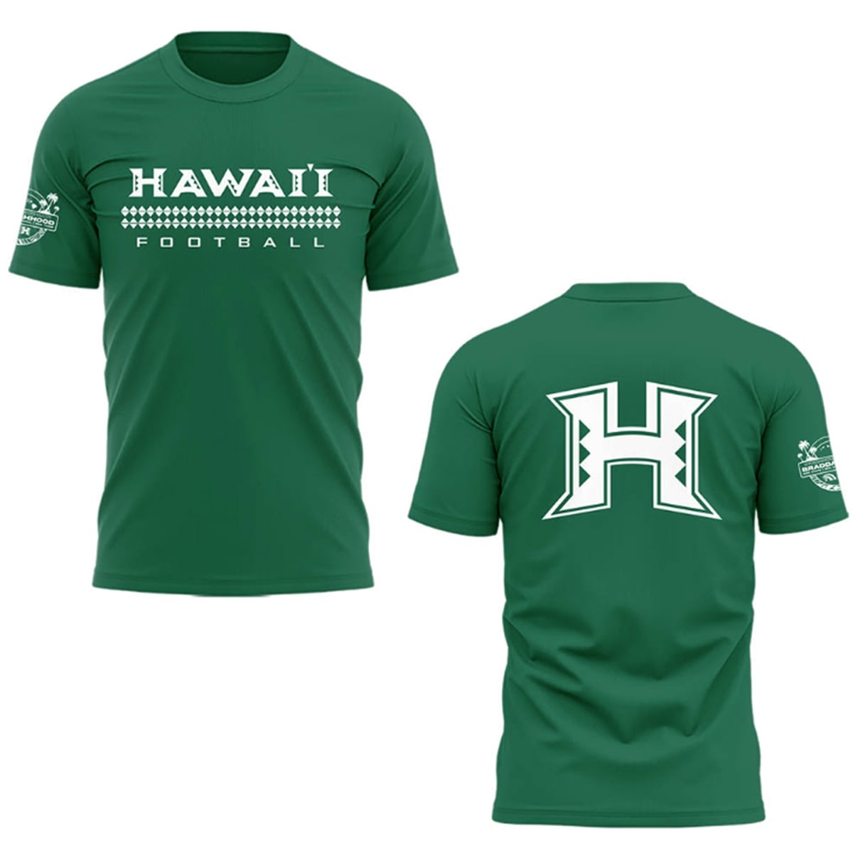 Every graphic element on this shirt carries profound significance. The distinct triangular bands underlining the chest typography represent spearheads, a traditional Polynesian symbol for courage, forward momentum, and the warrior spirit essential for gridiron battles. The bold “H” on the back is not just a letter; it is a geographical and emotional anchor, letting the world know exactly who the team represents. Finally, the “Braddahhood” sleeve emblem encapsulates the philosophy of the program—a deep, unbreakable bond of brotherhood, loyalty, and mutual respect that extends from the coaches to the players, and out to the fans.