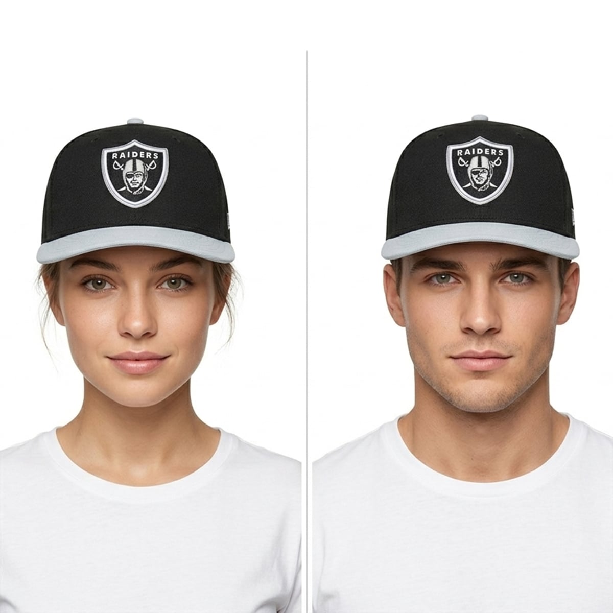 The hat represents a perfect fusion of modern sports fashion and classic franchise heritage. The design features a stark, deep black crown that serves as the perfect backdrop for the iconic Raiders shield, which is prominently displayed front and center. Contrasting the dark crown is a sleek, light grey brim, offering a dynamic two-tone visual that pops in any setting. Created specifically to be worn by the team’s newest rookies as they cross the draft stage, this headwear is the ultimate marker of the 2026 season. It transitions effortlessly from a sports collectible to a daily fashion staple, allowing fans to integrate their profound love for the team into their everyday wardrobe.