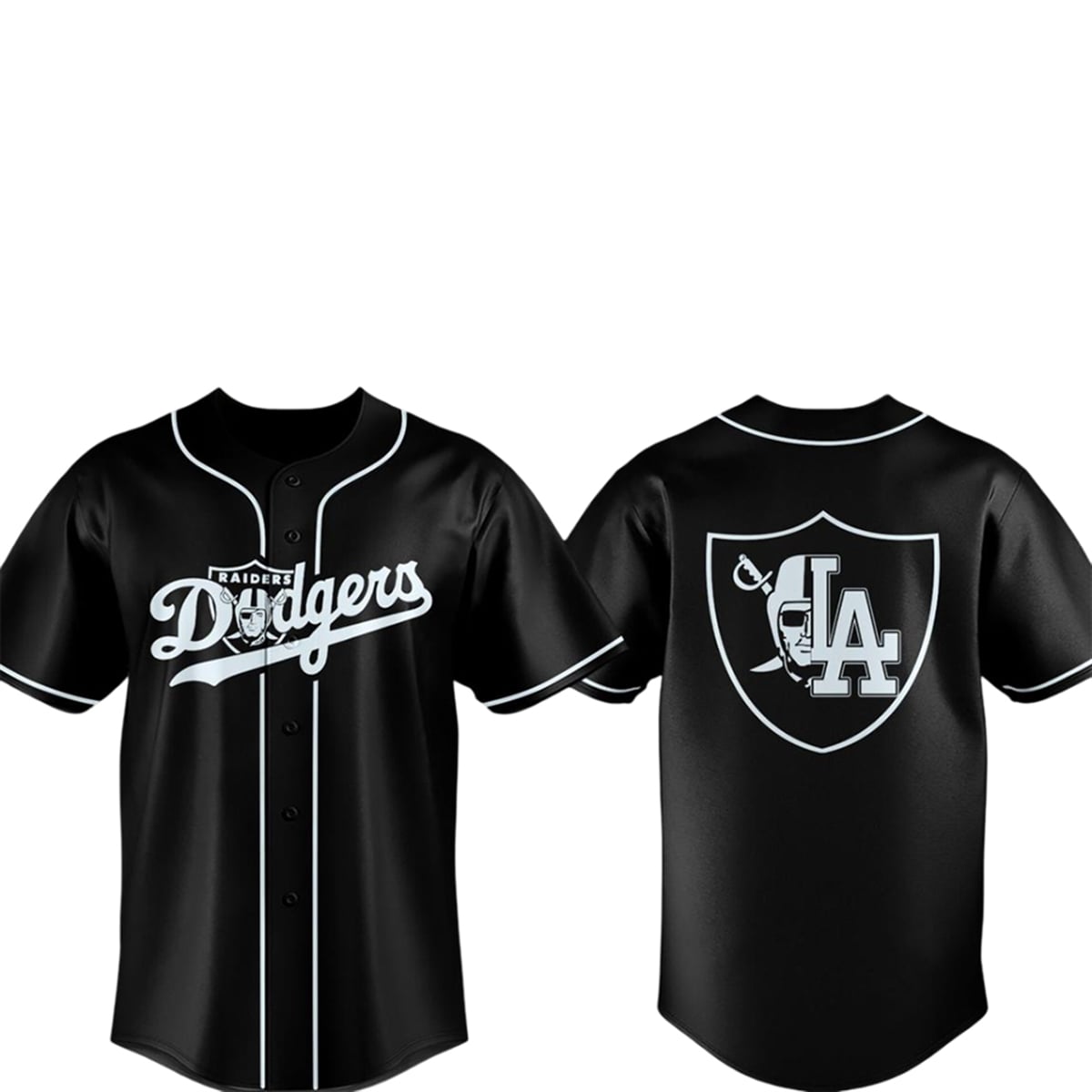The jersey is a masterclass in visual storytelling and sports typography. The garment features a profound black base contrasted sharply by stark white piping that traces the classic baseball silhouette. On the front, the legendary “Dodgers” script sweeps across the chest, ingeniously integrating the iconic Raiders shield behind the typography. Turning to the back reveals the true centerpiece: a massive, custom-designed crest that flawlessly splits the recognizable Raiders pirate face with the legendary interlocking “LA” Dodgers logo. It is a bold, monochromatic masterpiece designed to turn heads and dominate the visual landscape of any stadium or city street.