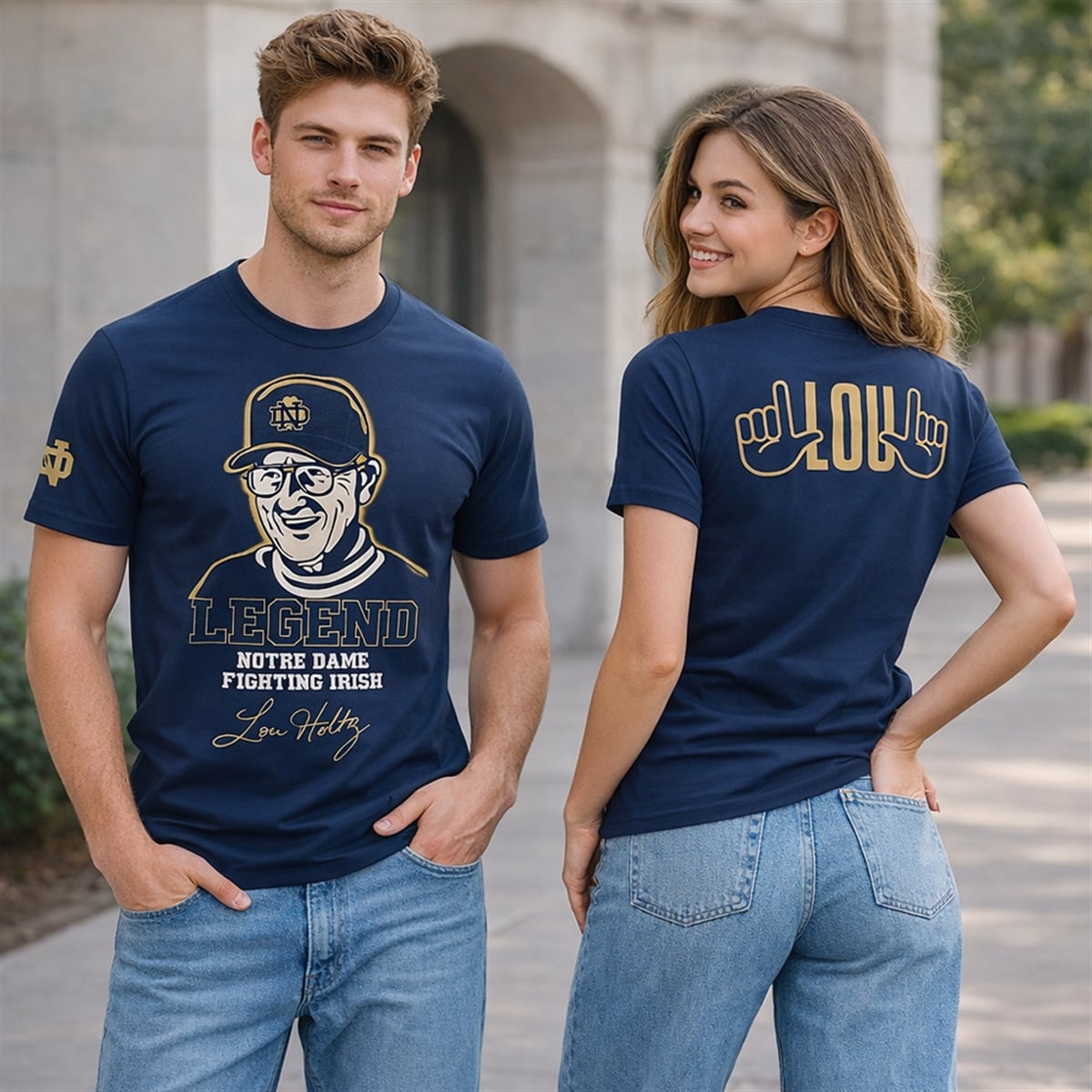 The back of the shirt features an incredibly clever and visually engaging graphic: the word “LOU” flanked by two illustrated hands making the “L” gesture, a recognizable nod to fan culture. To complete the look, the iconic interlocking “ND” logo is prominently displayed on the sleeves, ensuring that your team pride is visible from every angle.