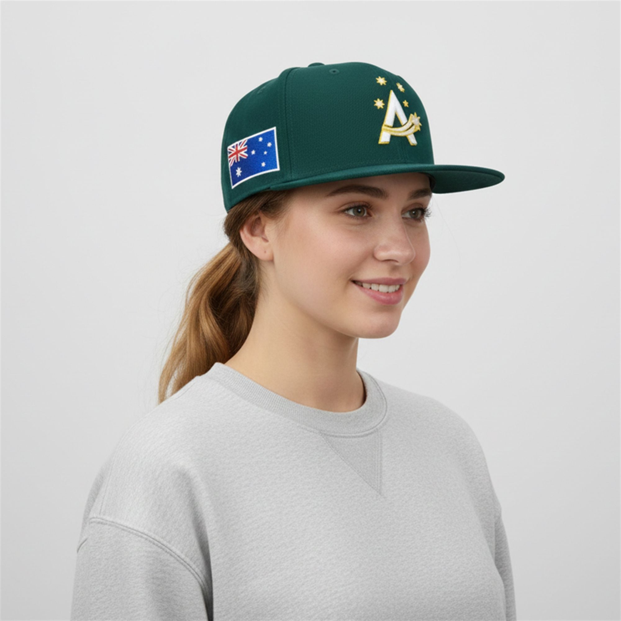 The centerpiece of the design is the raised “A” logo on the front panels. Rendered in brilliant white with gold outlining, it features a dynamic shooting star motif that pays homage to Australia’s Southern Cross constellation. The deep bottle-green fabric serves as the perfect canvas for the gold stars floating above the letter, creating a look that is instantly recognizable to baseball fans worldwide. On the wearer’s right side, a meticulously Australian flag patch adds an extra layer of authenticity and patriotism.