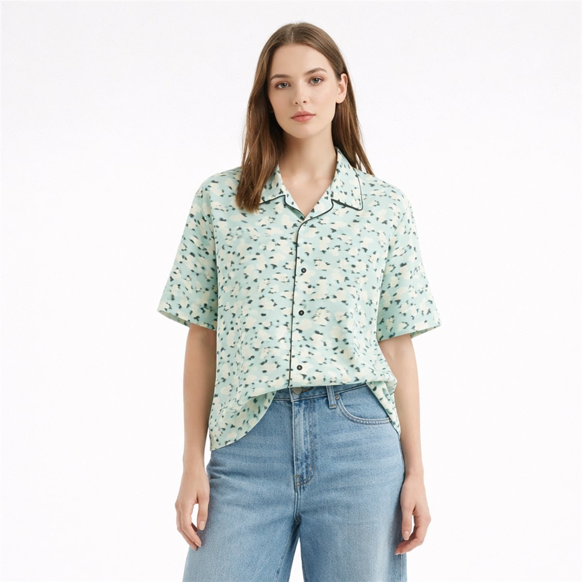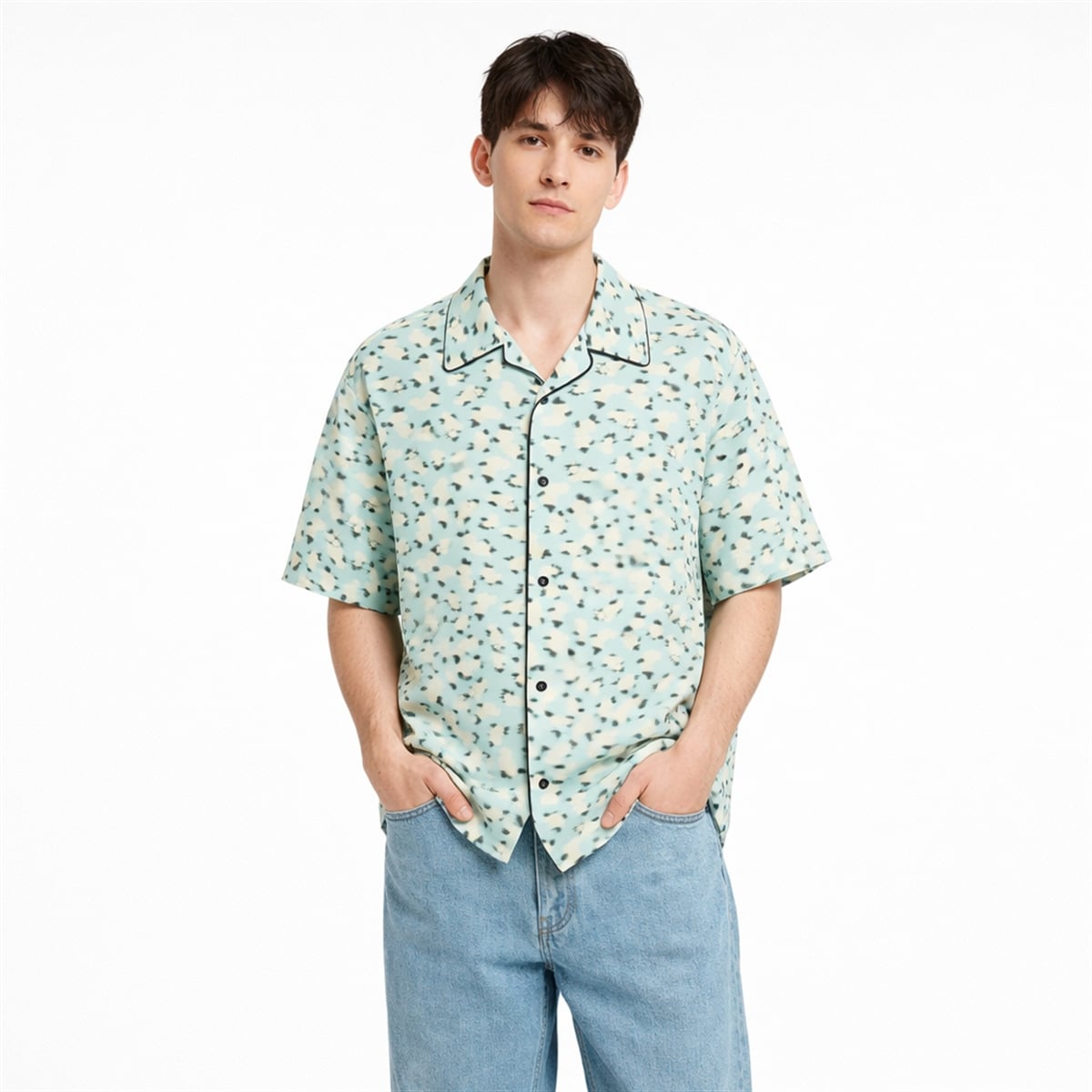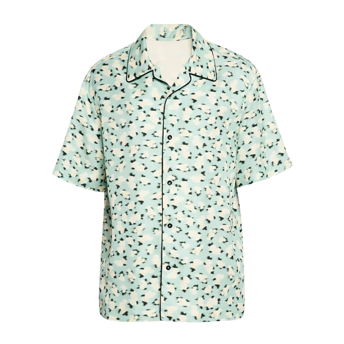 The shirt is a masterfully designed garment that redefines contemporary resort wear. Featuring a soft, pastel mint-green background, the shirt is adorned with an abstract, blurred floral pattern rendered in contrasting shades of cream and deep black. This innovative print creates a sense of motion and artistic flair, stepping away from the predictable, rigid botanical designs often associated with traditional island wear.
