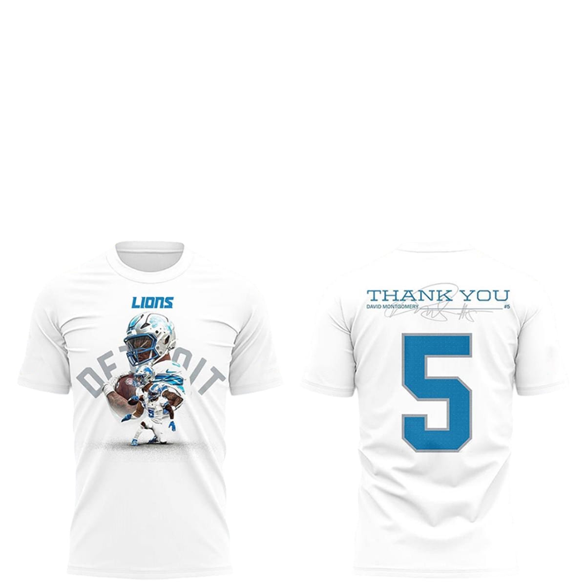 Turning to the reverse side, the garment transforms into a canvas of appreciation. It features the phrase “THANK YOU,” followed by “DAVID MONTGOMERY” and his signature number “5” rendered in the team’s Honolulu Blue and Silver colorway. A facsimile signature is elegantly placed above the number, adding a touch of personalized flair to the design. The stark white background serves as the perfect contrasting canvas, ensuring every graphic element, from the bold blue numbering to the intricate illustration, pops instantly.