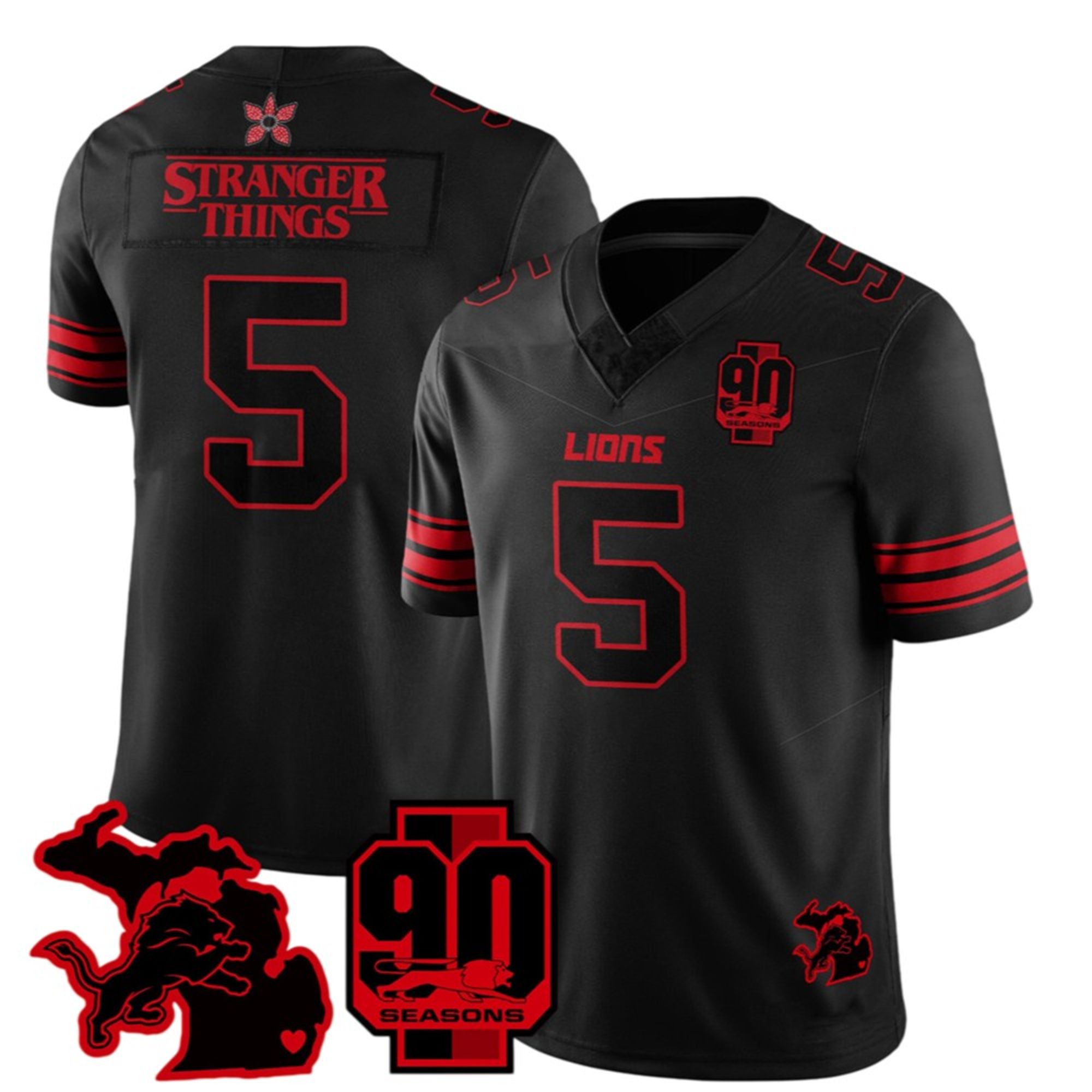 As we move into the 2026 season, standard home and away colors are essential, but the true fan seeks something unique. This jersey delivers exactly that by stripping away the traditional silver and blue for a bold, intimidating Black and Red aesthetic. The front proudly displays “LIONS” in the franchise’s modern font, while the back surprises onlookers with the iconic “STRANGER THINGS” typography in place of the player name, sitting above Goff’s number 5.