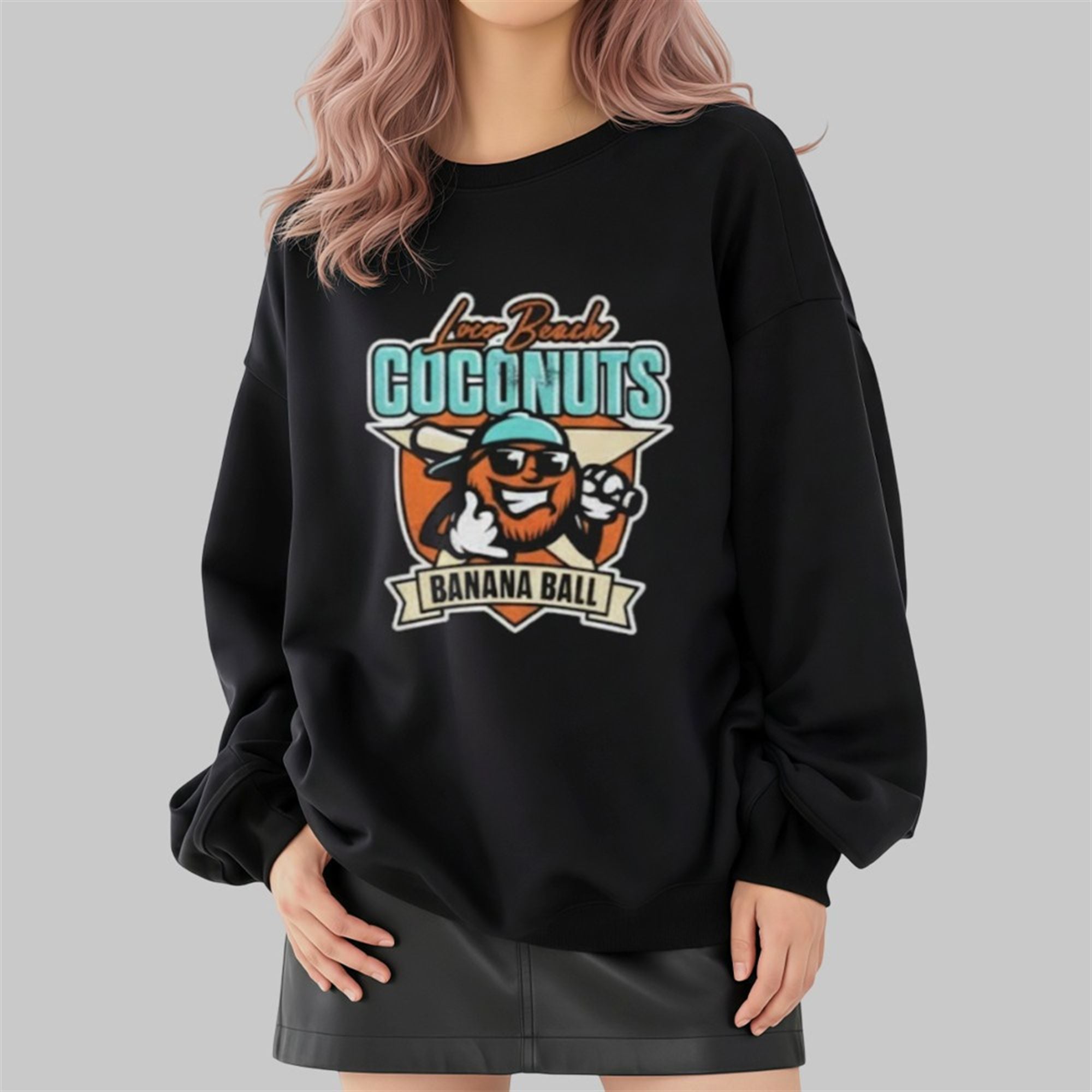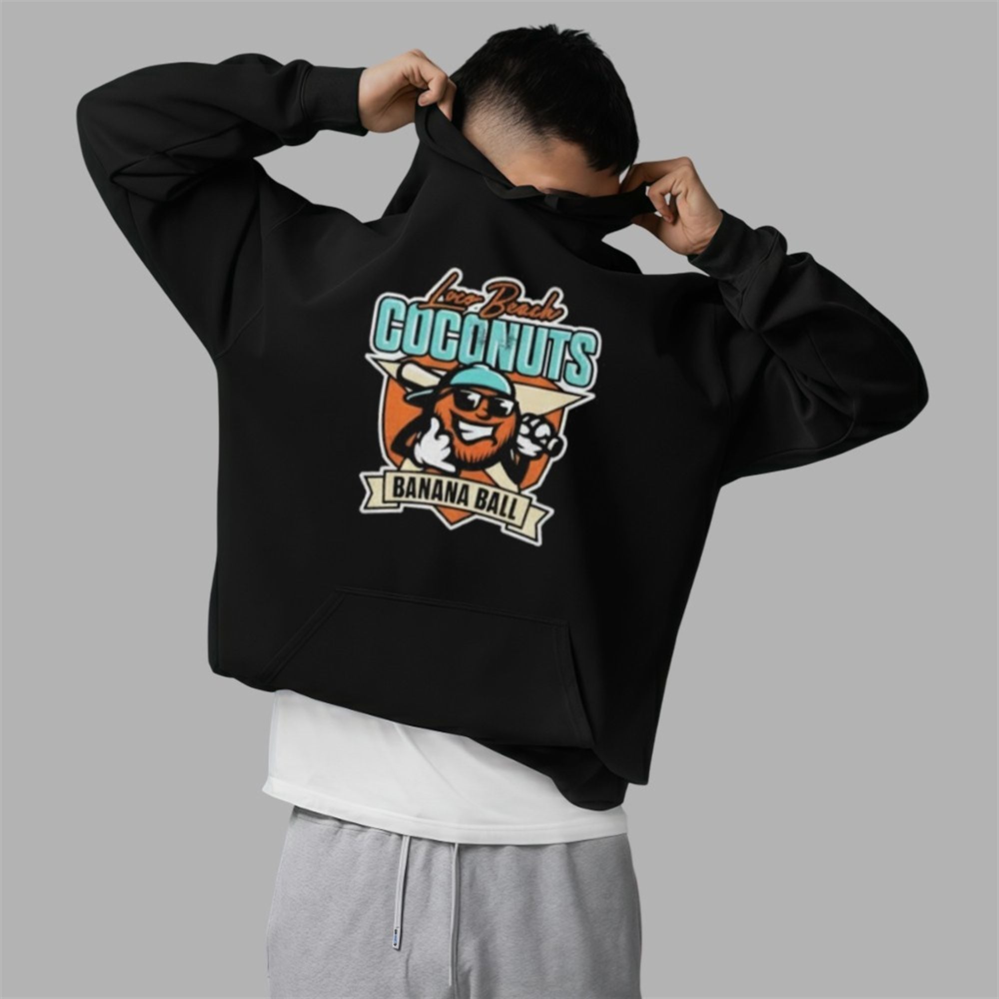 The centerpiece is the team’s charismatic mascot: a bearded, sunglass-wearing coconut sporting a backwards cap and throwing a “shaka” (hang loose) sign. It’s a design that signals you don’t take life too seriously, but you definitely take your fun seriously. Below the mascot, the “Banana Ball” banner cements this gear as merchandise of the fastest, most entertaining game in sports.