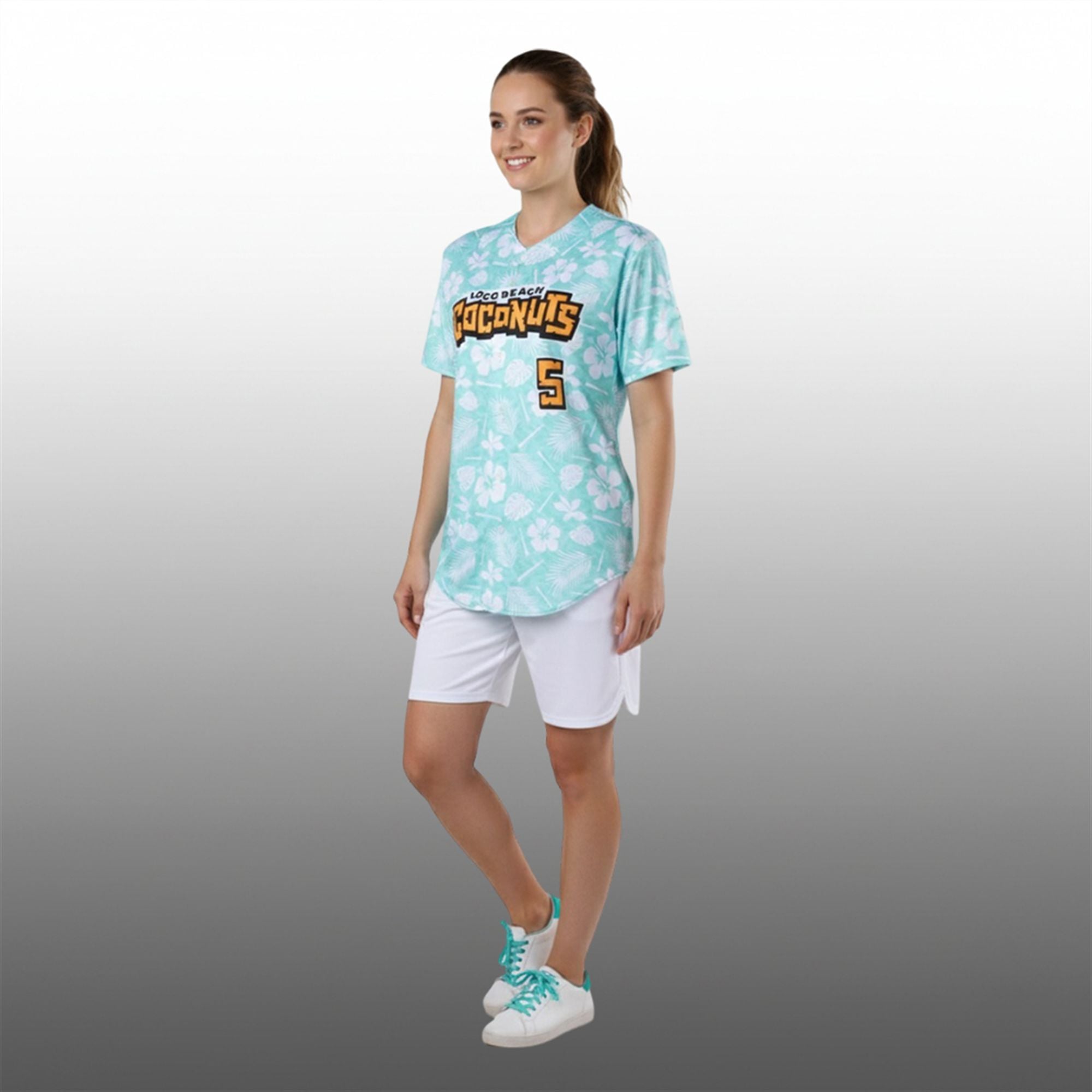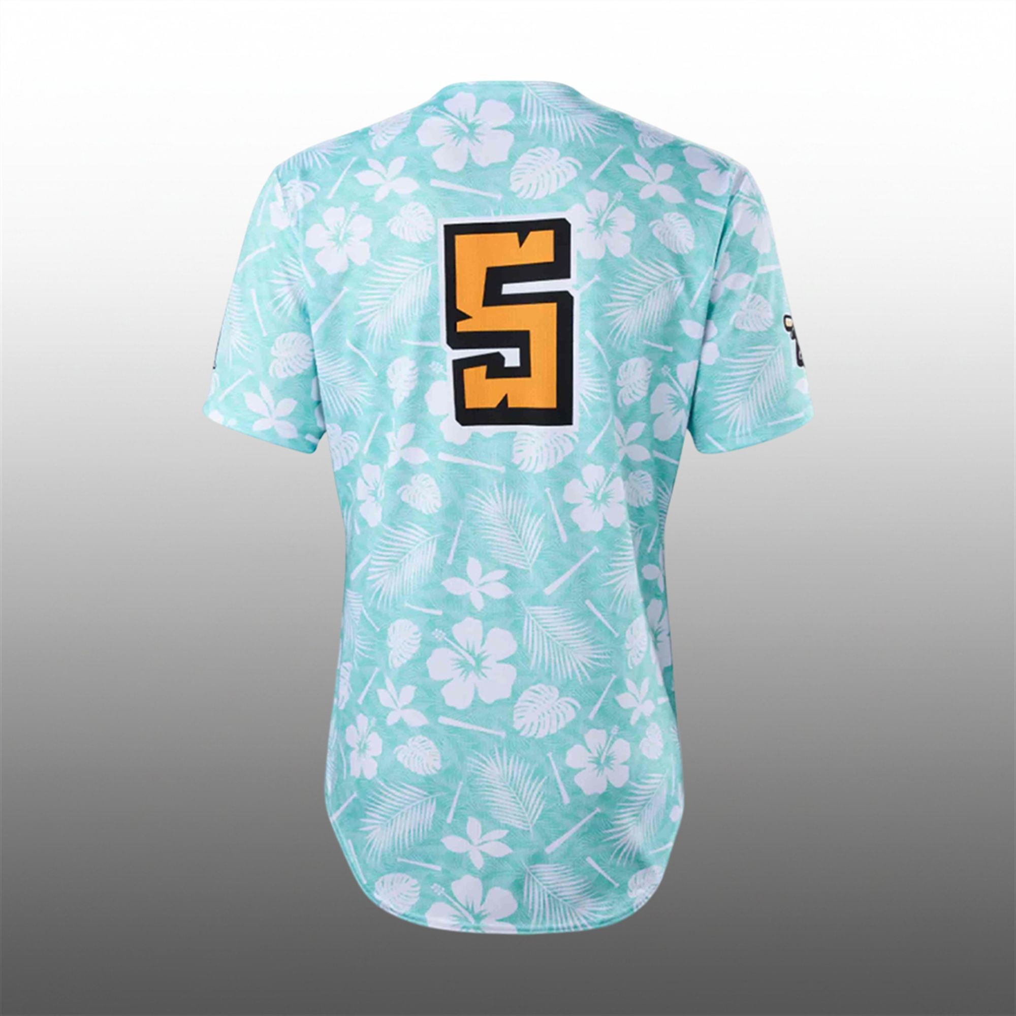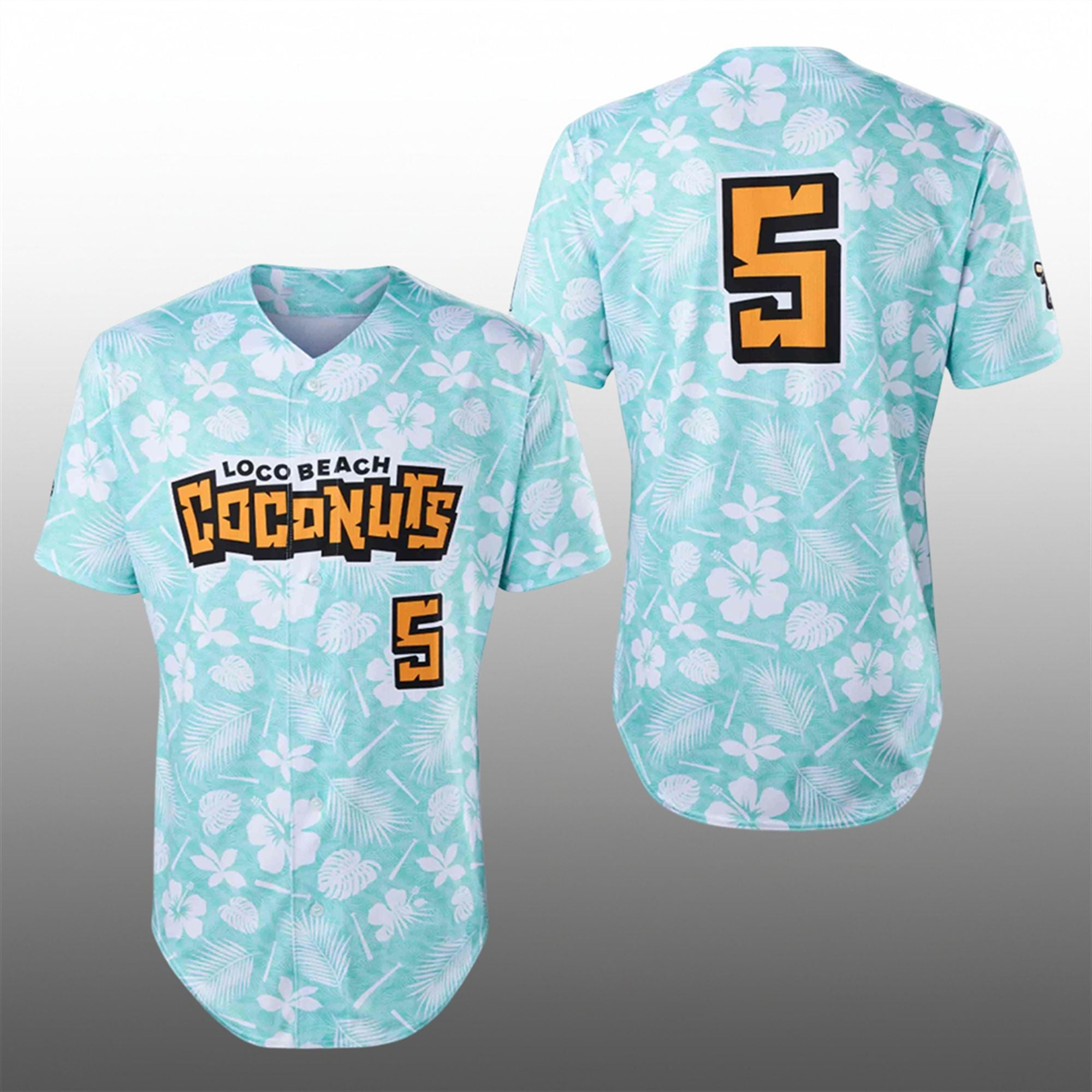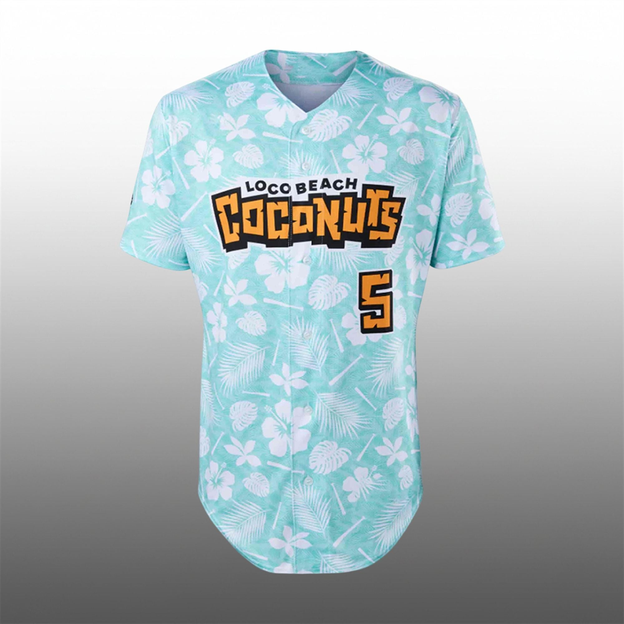The design features a vibrant, mint-aqua base completely submerged in a sublimated tropical pattern of white hibiscus flowers and swaying palm fronds. Across the chest, the “Loco Beach Coconuts” wordmark stands out in a bold, jagged, tiki-inspired font, outlined in sunset orange and black to ensure maximum visibility. The back features a large, block-style number “5”—a nod to the team’s status as the fifth franchise entering the league. Finished with a classic full-button front and a rounded hem, this jersey seamlessly blends the traditional baseball silhouette with a loud, fun, vacation-ready aesthetic.
