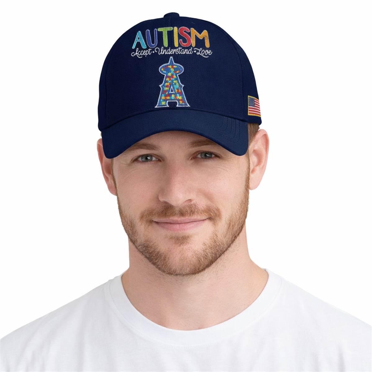 The hat is a visionary piece of sports memorabilia that merges franchise pride with a profound social cause. The cap features a deep navy blue base, ensuring the vibrant, multicolored graphics on the front panel truly stand out. Across the crown, the word “AUTISM” is prominently displayed in playful, brightly colored lettering, underscored by the powerful directive: “Accept – Understand – Love” in an elegant cursive script. Taking center stage is the iconic Los Angeles Angels ‘A‘ logo with its signature halo, brilliantly reimagined with an intricate, multi-colored puzzle-piece pattern. Adding a touch of national pride, a beautifully embroidered United States flag sits proudly on the side panel. This cap is entirely focused on delivering a powerful visual message of unity and awareness.