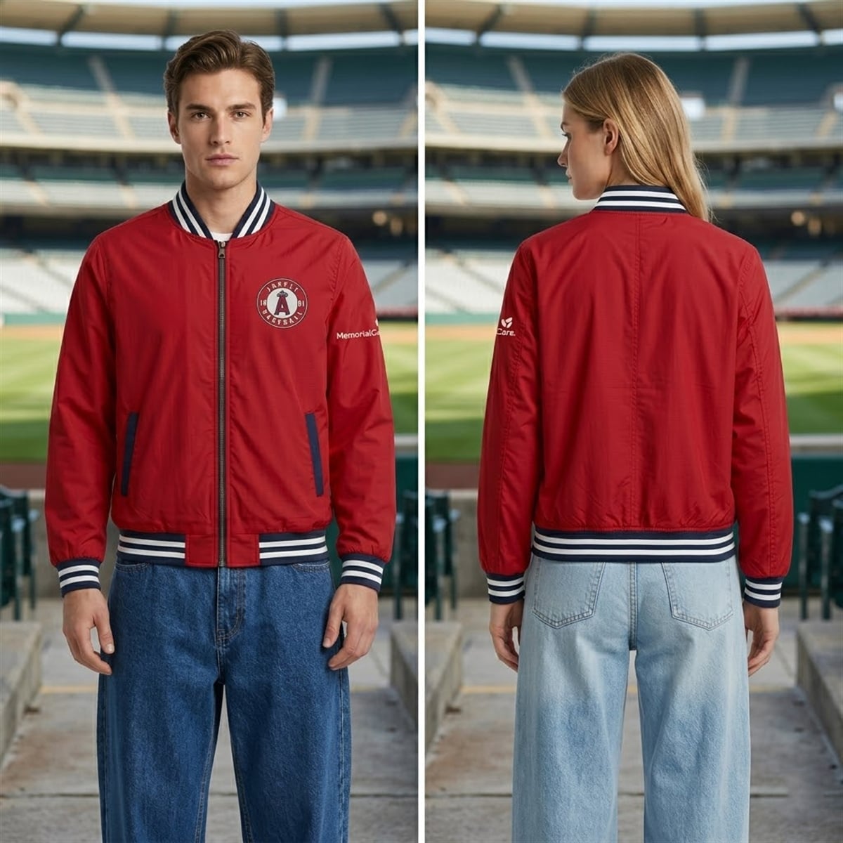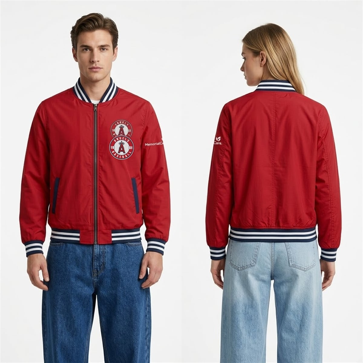 The jacket is a visually striking piece of sports apparel designed to celebrate the dedication of the team’s fan base. The jacket features a bold, vibrant red primary color that instantly aligns with the Angels’ iconic visual identity. On the left chest, the classic circular Angels baseball logo is proudly displayed, while the right sleeve features the MemorialCare sponsor logo, solidifying its status as a stadium promotional item. The design is anchored by navy blue and white contrasting stripes along the ribbed collar, cuffs, and hem, giving it a timeless, athletic silhouette. Deep navy pocket trim completes the look, adding a subtle touch of visual balance.