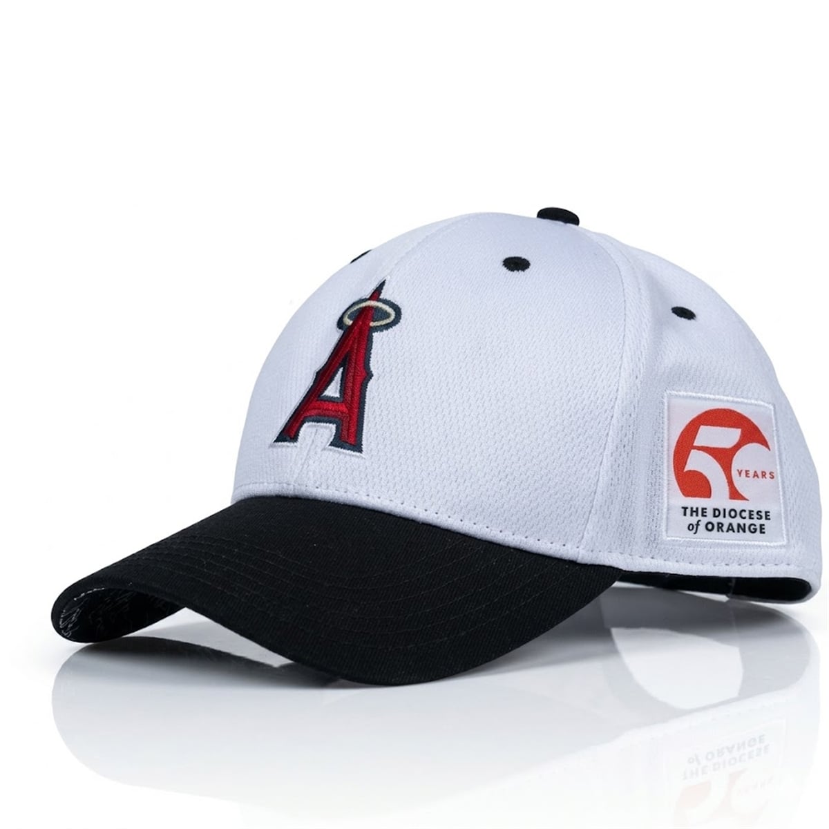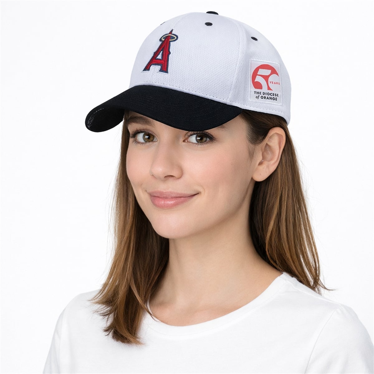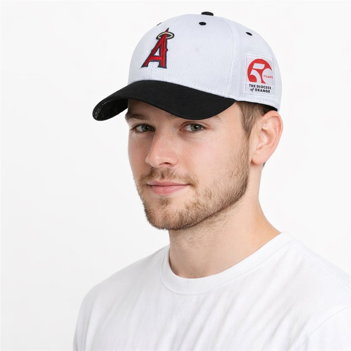 The hat is a highly coveted collectible that celebrates the intersection of professional sports and community heritage. Visually, the cap features a pristine white crown contrasted elegantly by a solid black bill. Front and center sits the classic Los Angeles Angels “A” logo, complete with the iconic silver halo. What truly sets this item apart is the prominent side patch, beautifully showcasing the “50 Years – The Diocese of Orange” anniversary emblem in vibrant red, white, and black. This design captures a clean, timeless aesthetic while loudly broadcasting regional pride.