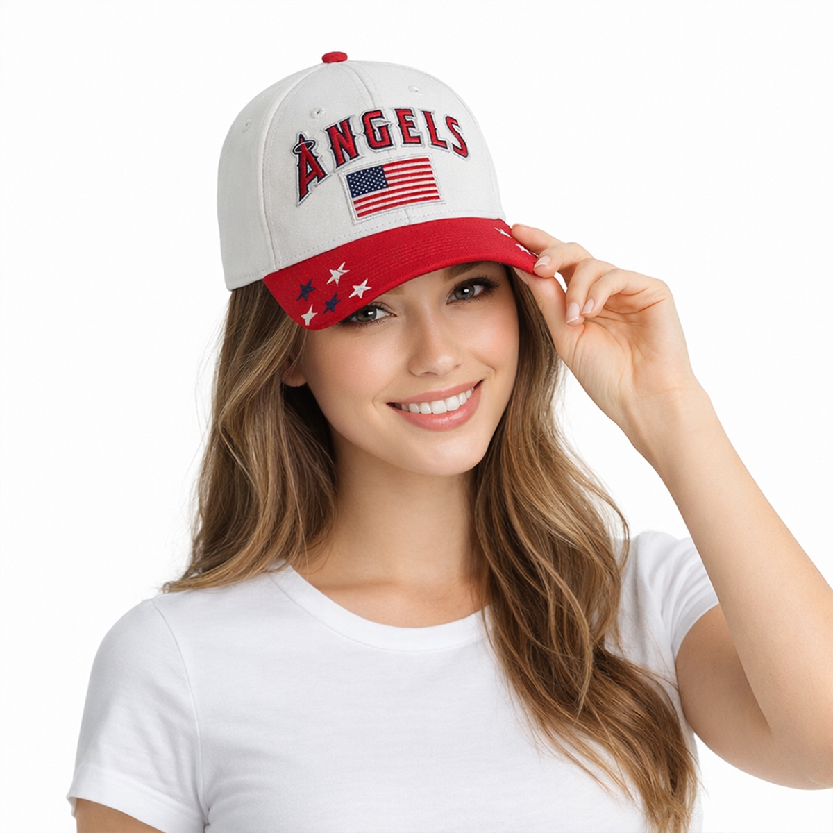 The hat is a visually captivating piece of sports apparel designed to commemorate the spirit of American baseball. The cap features a crisp, bright white crown that serves as a perfect canvas for the classic “ANGELS” text, completely integrated with the famous halo emblem. Positioned proudly beneath the team name is a beautifully rendered American flag patch, anchoring the design with national significance. The striking contrast is completed by a vibrant red brim, which is heavily stylized with a constellation of embroidered stars in navy and white. This bold color-blocking strategy creates a dynamic, stadium-ready aesthetic that commands attention.