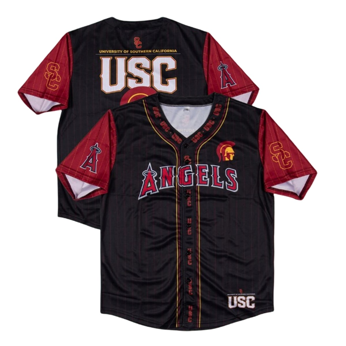 The jersey is a stunning visual tribute to two beloved institutions. Moving away from standard team colors, this bold design utilizes a sleek black base accented with striking crimson-red sleeves and subtle vertical pinstripes. The front proudly displays the classic “ANGELS” typography alongside the legendary USC Trojan mascot logo on the chest. Turn the jersey around, and the “UNIVERSITY OF SOUTHERN CALIFORNIA” lettering commands attention, accompanied by oversized “USC” graphics. From the interlocking “SC” to the iconic Angels halo logo stamped on the sleeves, every visual element is meticulously placed to honor both historic brands.