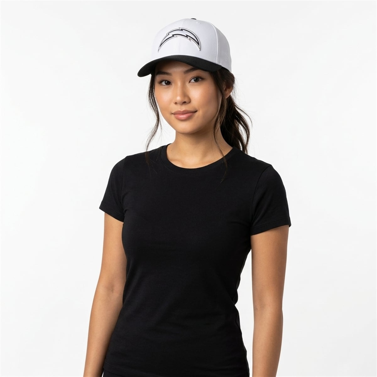 The hat captures the essence of a modern sports franchise evolving into a new era. Featuring a crisp white crown contrasted sharply by a deep black bill, the visual impact is immediate and commanding. Front and center sits the iconic Los Angeles Chargers lightning bolt, rendered in a striking silver, black, and white colorway that gives it a dynamic, three-dimensional appearance. This design choice strips away the traditional powder blue for a more aggressive, stealthy look that resonates with contemporary fashion trends. It is a visual representation of speed, power, and the electrifying energy that the team brings to the field.