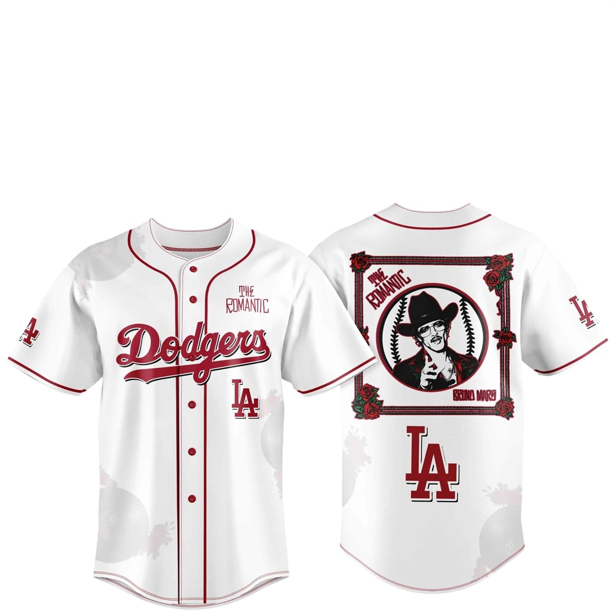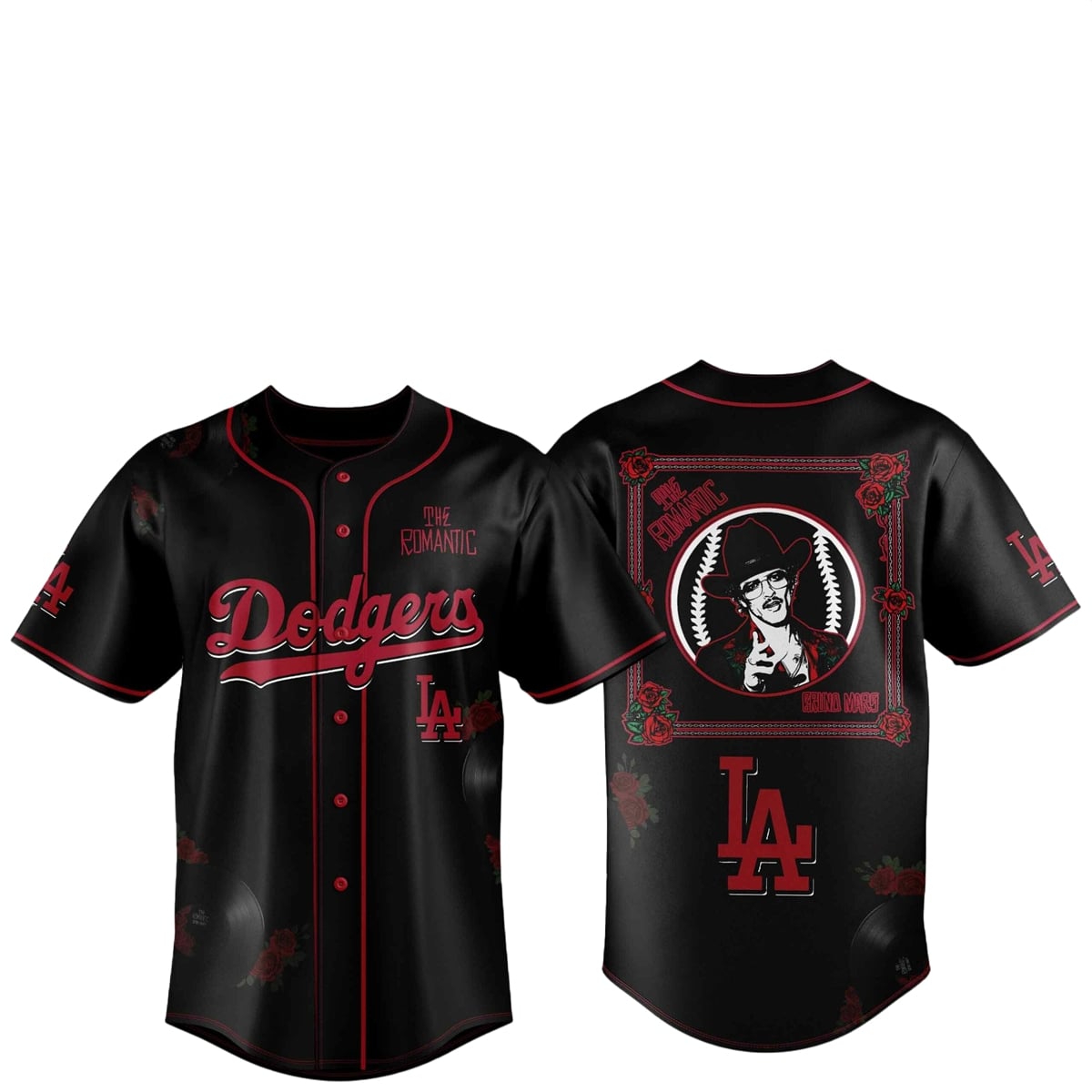This jersey is a wearable love letter to the city of Los Angeles—a global epicenter where sports glory and entertainment magic are constantly intersecting. The use of the Dodgers’ branding symbolizes teamwork, legacy, and the classic California dream. The addition of the deep red roses and the cowboy motif from “The Romantic” tour introduces a layer of passion, theatricality, and vintage charm. Together, the design suggests that whether you are hitting a home run in Chavez Ravine or putting on a multi-platinum stadium show, the energy of LA is universally captivating.