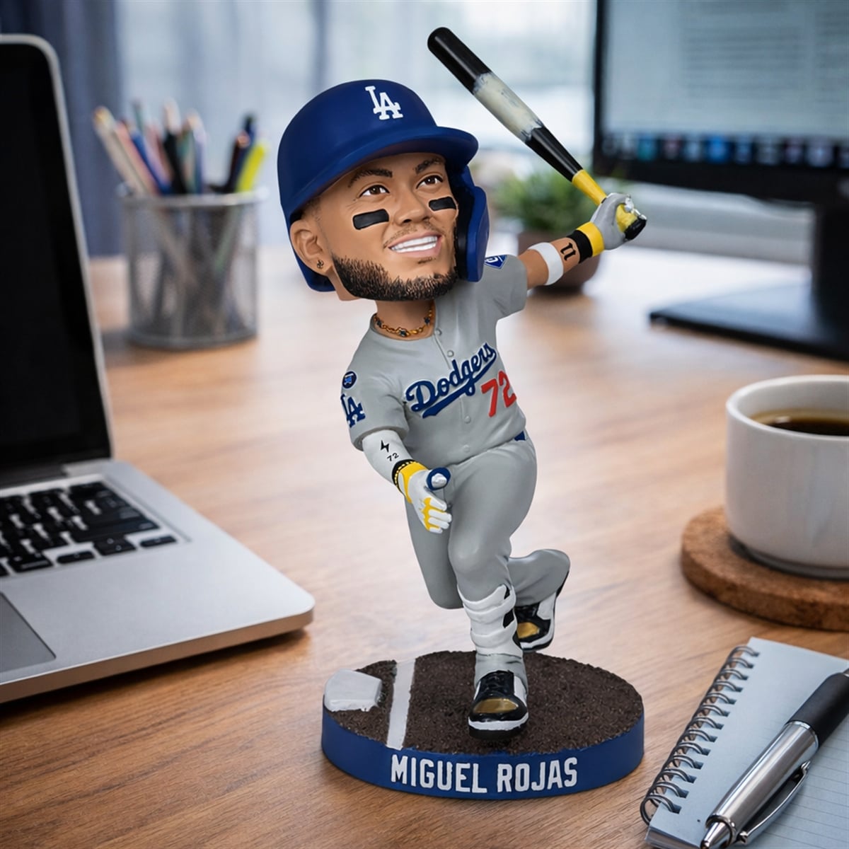 This commemorative piece freezes a legendary fraction of a second in Los Angeles Dodgers history. The figure features Miguel Rojas in his classic grey away uniform, complete with the iconic blue “Dodgers” script across the chest and the recognizable red numbering. Capturing his exact post-swing swagger, the bobblehead displays Rojas with his signature eye black, holding his bat high in his left hand while confidently rounding the bases. Every visual aspect, from the wristbands to the determined expression on his face, reflects the intense atmosphere of a winner-take-all Game 7 matchup. Resting on a dirt-textured base featuring home plate and his name prominently displayed, this item is a precise dimensional representation of a defining career moment.