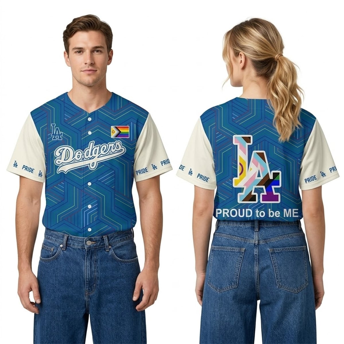 The jersey is a masterclass in modern sports aesthetics and meaningful design. The front of the jersey features a mesmerizing, geometric blue pattern composed of intersecting lines and chevrons, offering a futuristic update to traditional Dodger Blue. The classic “Dodgers” script sweeps across the chest, beautifully juxtaposed against a prominent Progress Pride flag patch over the heart. The sleeves provide a crisp visual contrast in solid white, accented by subtle, repeating “PRIDE” text and the LA logo along the cuffs. Turning the jersey around reveals its true showstopper: a massive interlocking “LA” logo completely filled with the vibrant colors of the Progress Pride flag, anchored heavily by the bold, empowering text reading “PROUD to be ME.”