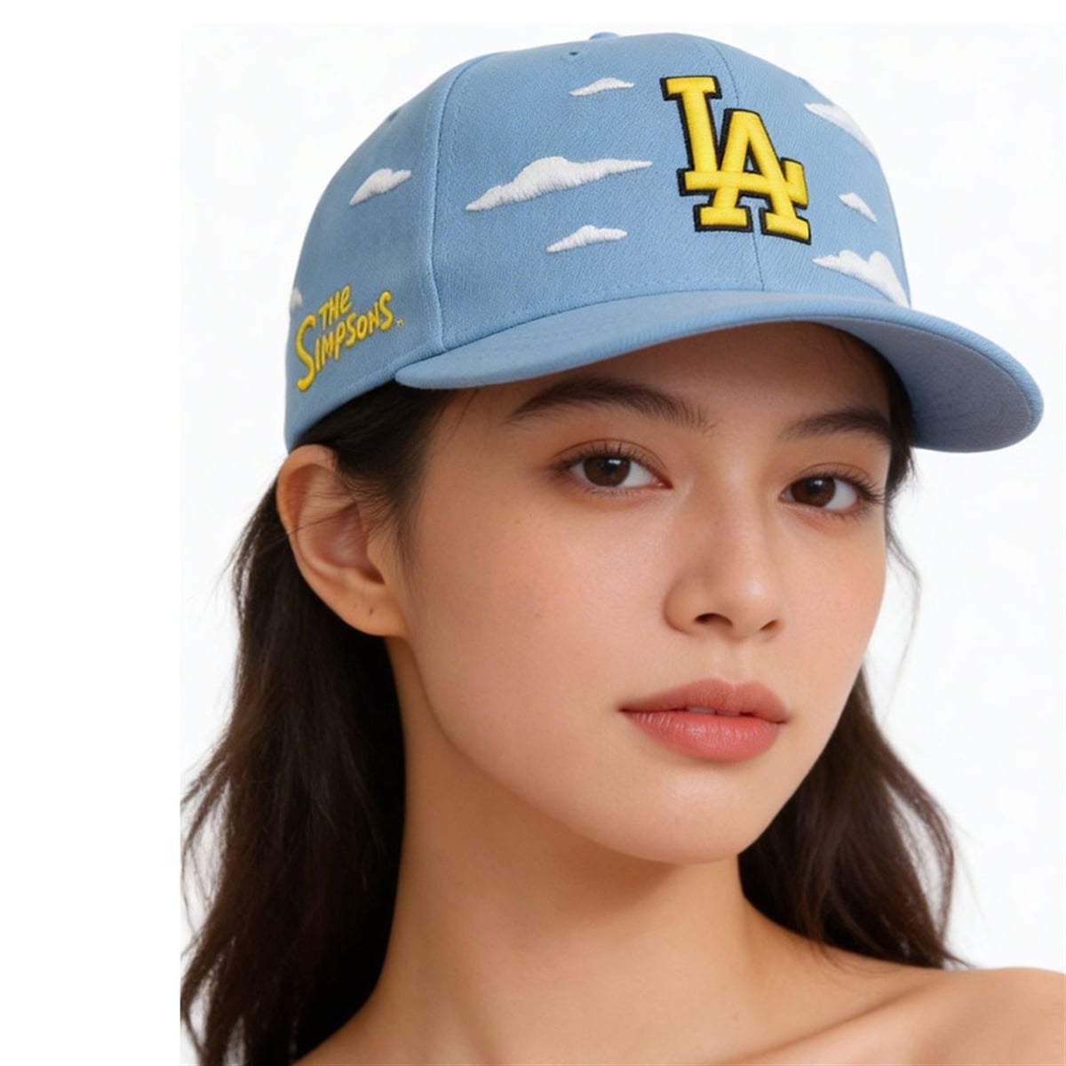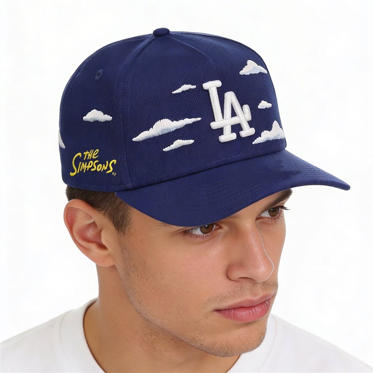 Every visual element of this hat carries deep symbolic meaning. The sky-blue background and the floating white clouds are a direct homage to the opening sequence of The Simpsons, a visual that has signaled comfort, comedy, and entertainment to millions of viewers for decades. By integrating the Dodgers’ interlocking “LA” logo over this specific sky, the design conceptually relocates the city of Los Angeles right into the heart of Springfield. Furthermore, the decision to transform the traditionally blue or white Los Angeles Dodgers “LA” into a striking, vibrant yellow is a brilliant conceptual choice; it bridges the gap between the two worlds, matching the iconic skin tone of the show’s characters and the classic font of the series’ title card featured proudly on the side of the cap.