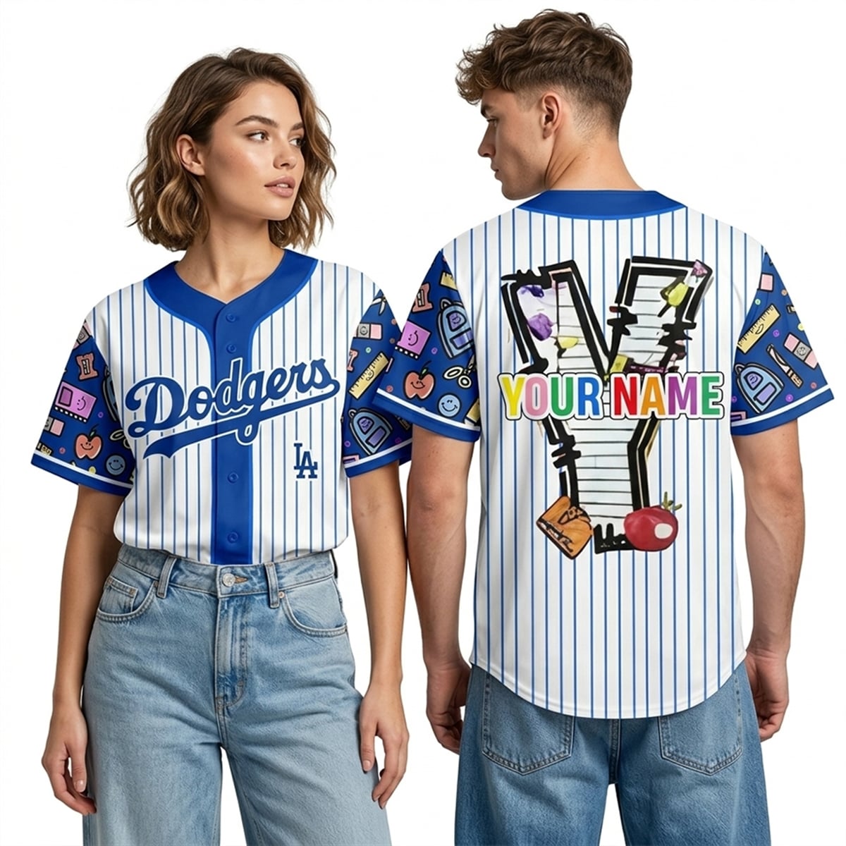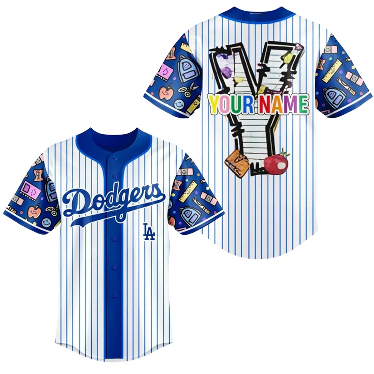 This visually dynamic baseball jersey takes the classic Los Angeles Dodgers aesthetic and reimagines it for the educational world. The front boasts the traditional Dodgers script logo set against crisp, classic pinstripes, ensuring undeniable team recognition. However, the true magic lies in the custom details. The sleeves feature a lively, cartoon-style pattern packed with quintessential school supplies—smiling backpacks, scissors, apples, rulers, and erasers—set against a bold blue background.