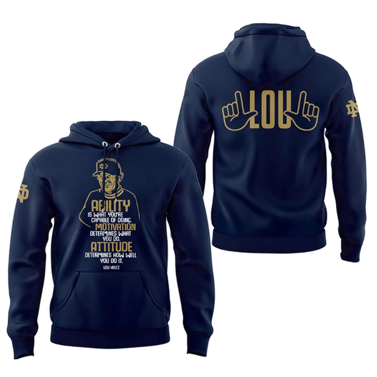 This navy blue and gold statement piece is a visual tribute to a college football icon. The front of the shirt immediately commands attention with a stylized, golden line-art portrait of Coach Lou Holtz wearing his signature ‘ND‘ cap. Below the portrait is a masterfully arranged typographic display of his most famous maxim. The words ABILITY, MOTIVATION, and ATTITUDE are boldly emphasized, creating a clear visual hierarchy that draws the eye.