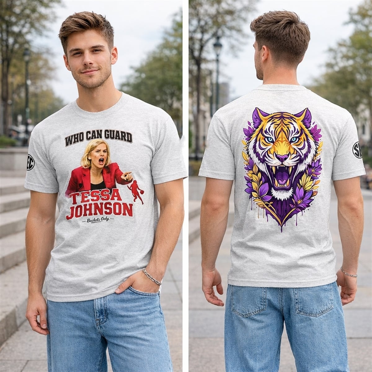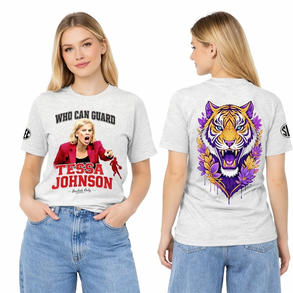 This piece of fan apparel is a bold, dual-sided tribute to one of the most talked-about moments in recent college basketball history. The front of the design pulls no punches, featuring a highly stylized caricature of LSU head coach Kim Mulkey in her signature bright red jacket, visibly distressed and pointing aggressively. Above her, the legendary quote “WHO CAN GUARD” sits in bold, varsity-style lettering, followed by “TESSA JOHNSON” in striking red text. The phrase “- Buckets Only -” and a sleek red basketball player silhouette complete the front graphic, alongside a classic SEC logo on the sleeve.