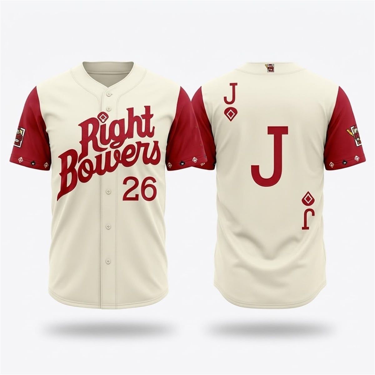 The jersey is a visual standout that immediately commands attention. The front of the garment features the stylized, swooping “Right Bowers” script in a striking crimson red, set against a classic, vintage-inspired cream background. Prominently displayed beneath the script is the number 26, signifying the highly anticipated 2026 season. Contrasting vibrant red sleeves add a dynamic pop of color, adorned with subtle, intricate card suit graphics near the hems. However, turning the apparel around reveals its true party piece: a massive, bold “J” alongside the diamond suit, perfectly mirroring the iconic, timeless look of a traditional playing card.